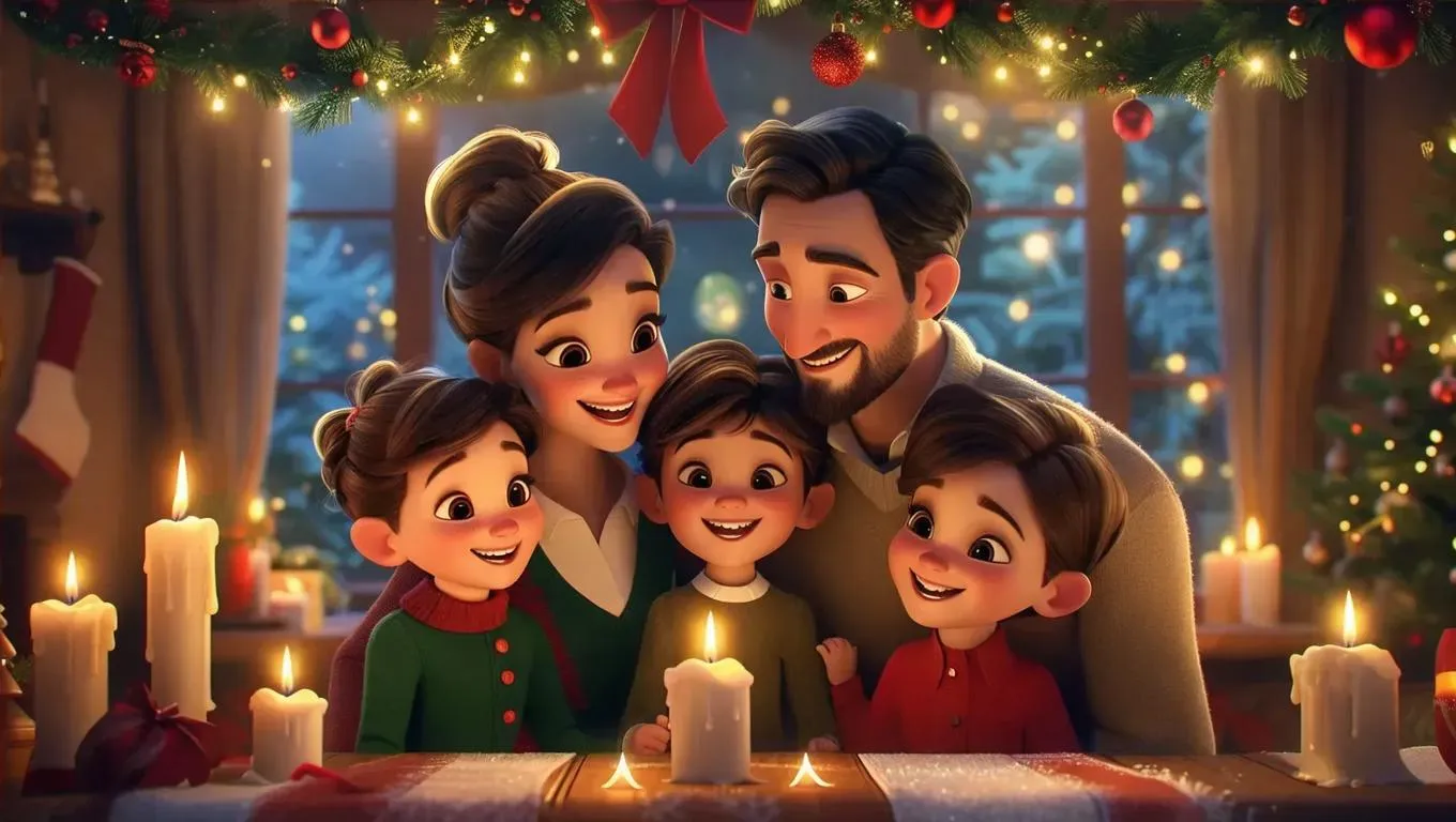 Create a heartwarming AI-generated illustration of a joyful family under mistletoe in a candlelit room. Features full-body poses, dynamic symmetry, and a folded ponytail. Perfect for festive visuals with professional-grade effects by vivago.ai.