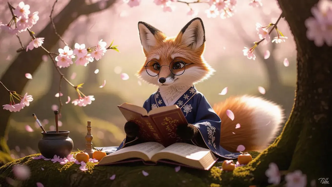 AI-generated guóhuà-style artwork depicts a scholarly fox in indigo hanfu with silver peony embroidery reading under cherry blossoms. Simplified Chinese painting features fluffy tail, calligraphy scrolls, paper lanterns, and porcelain teacups amidst golden hour light. Traditional aesthetics meet AI creativity in this whimsical forest scene blending ink textures and hanfu elegance.