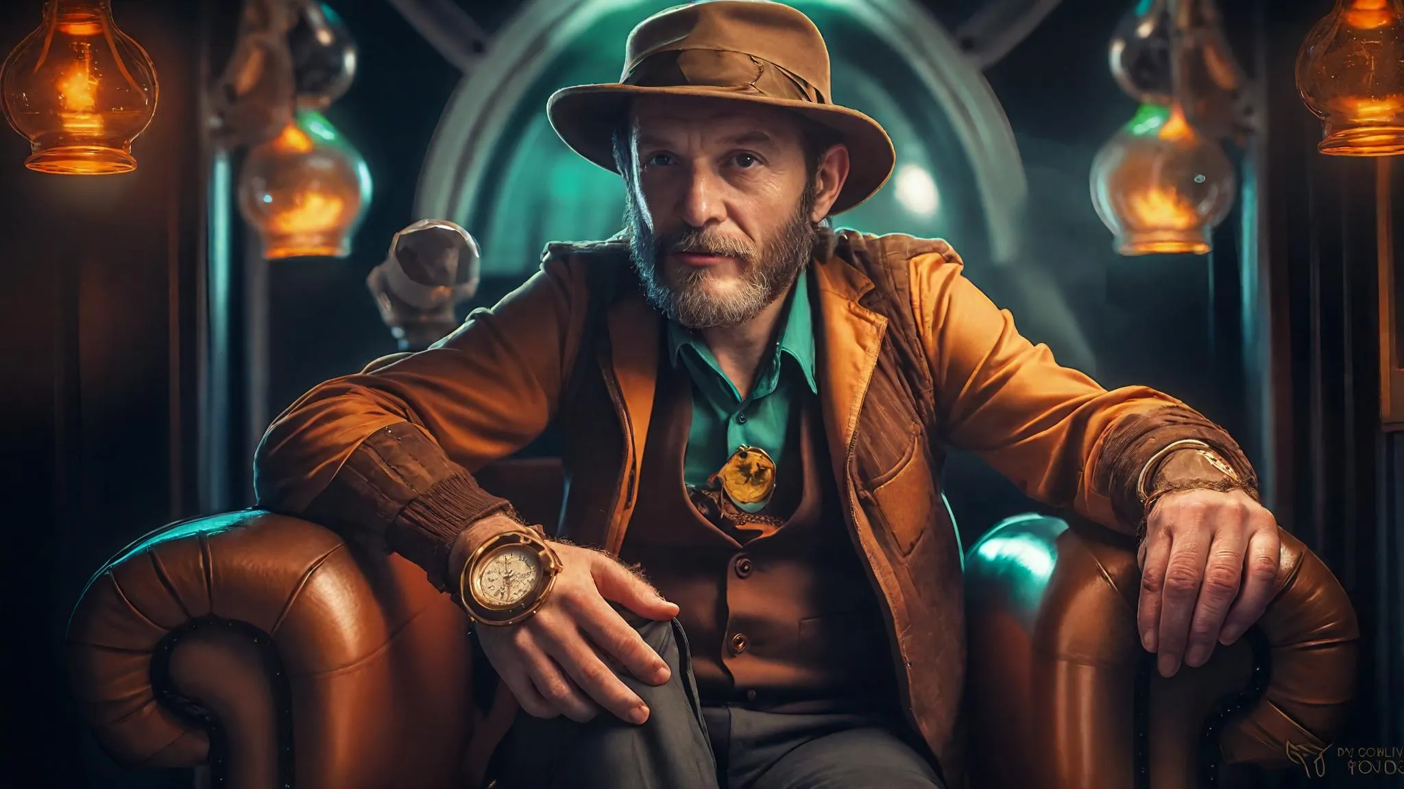 A man in his 50s-60s sits in an antique armchair, dressed in 60s fashion, with a fedora. The dimly lit room is furnished with late 19th-century decor. He holds a half-full glass of whiskey, looking slightly sad with a slight smile. The close-up captures his upper body, exuding a mafia boss vibe. Gloom, ultra HD, profile, front view.