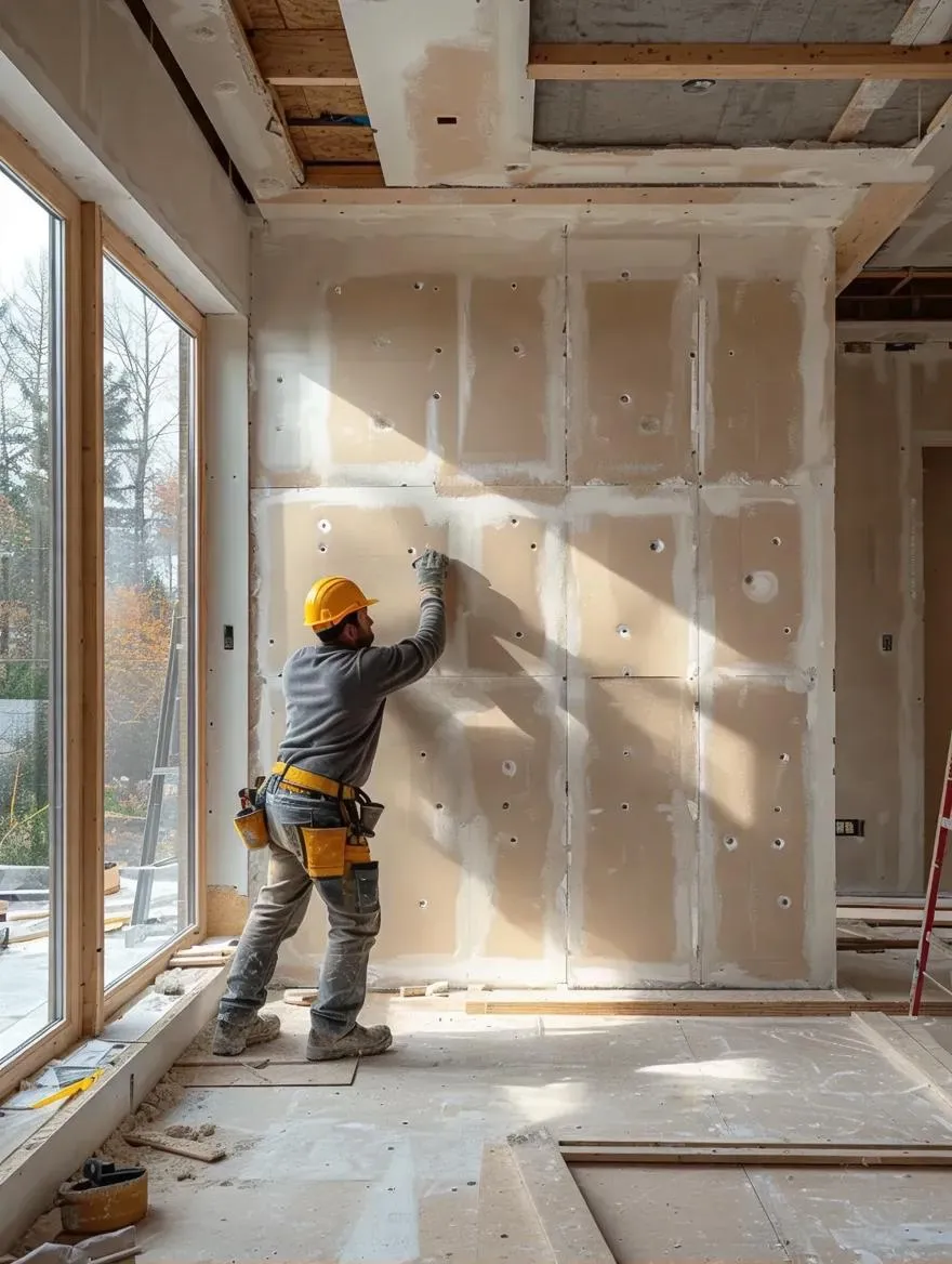 Craft AI-generated visuals of modern minimalist homes with precision plasterboard wall construction. Showcase skilled craftsmanship, seamless finishes, and professional artistry under soft natural light. Elevate home improvement projects using advanced AI tools for realistic, detailed designs blending sturdy functionality and elegant simplicity.