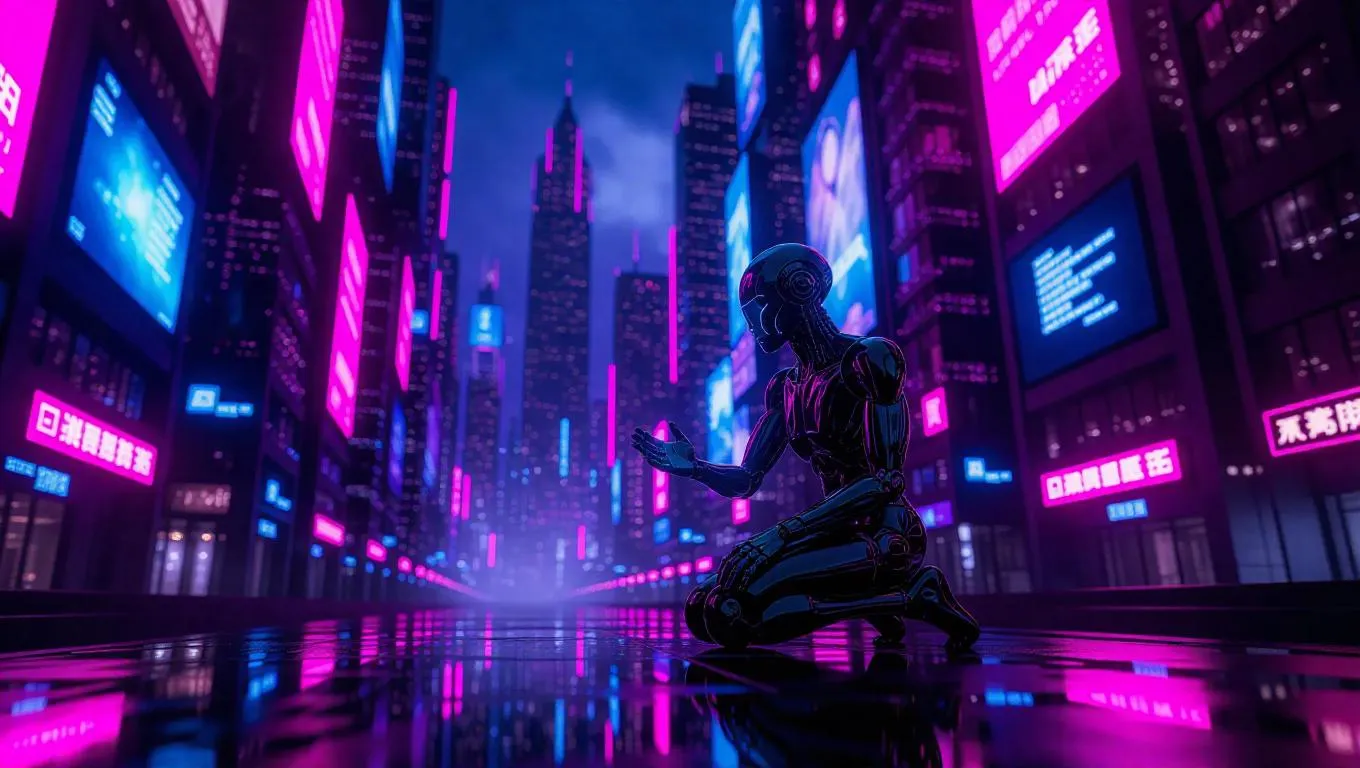 Futuristic metropolis with neon-drenched skies, iridescent skyscrapers, and holographic constellations. Biomechanical android emits prismatic energy waves amid levitating bioluminescent transports. Cyberpunk chiaroscuro contrasts azure shadows and magenta spotlights. Hyper-detailed 8K cinematic framing with Dutch angles blurs quantum-reinforced spires into infinity. AI-powered visuals for immersive cyberpunk scenes, blending hyper-realism and dramatic depth-of-field.