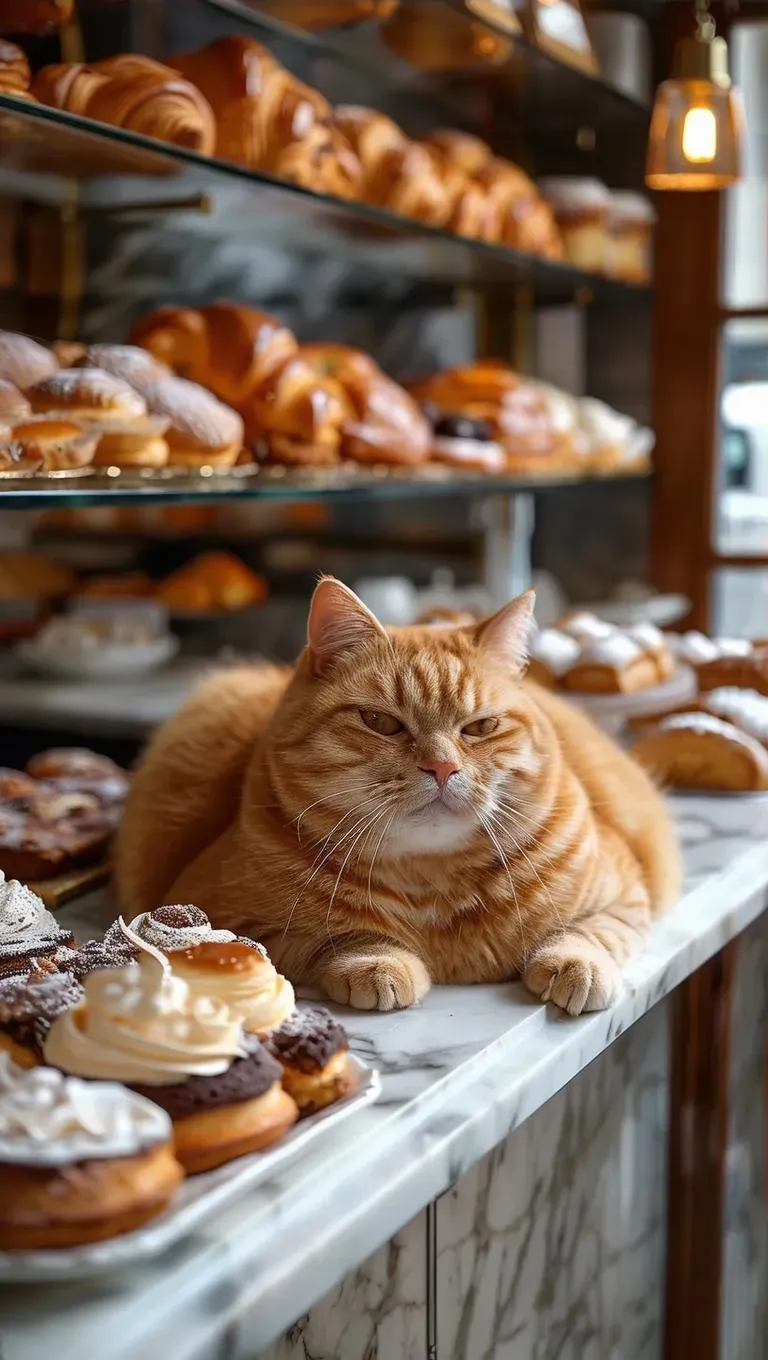 Generate a hyper-realistic AI image of a plump cat lounging in a cozy pastry shop with vivid textures, baked goods, and warm lighting. Vivago.ai crafts lifelike visuals from text prompts, perfect for whimsical storytelling, social media, or commercial projects. Explore AI-powered creativity with precise fur details and mouthwatering bakery ambiance.