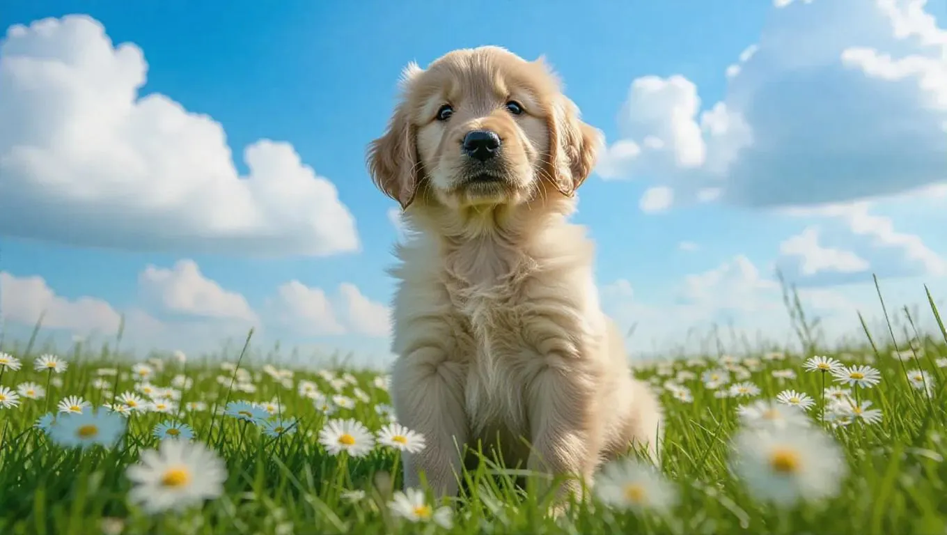 Ultra-realistic golden retriever puppy in vibrant meadow with emerald grass, white daisies, and fluffy cumulus clouds. Rendered in cinematic Kodak Ektachrome tones, shallow depth of field emphasizes puppy's innocent expression against dreamy backdrop. Ultra-detailed textures, soft-focus lighting, AI-generated imagery captures playful curiosity and idyllic charm.