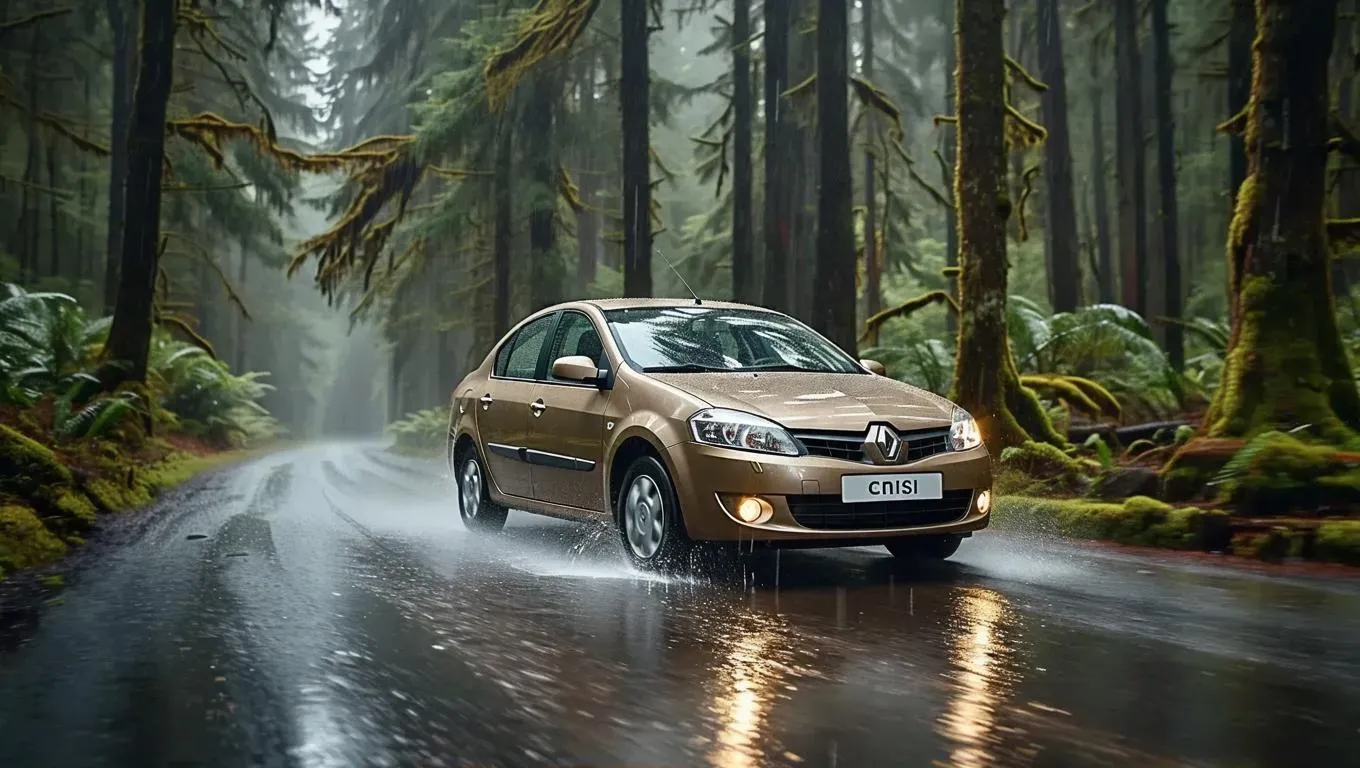 Generate a realistic AI image of a sand-colored Renault Symbol 2008 1.4 sedan driving on a rainy forest road. Transform text prompts into vivid visuals with VivaGo.ai's advanced AI tools for lifelike car imagery, atmospheric settings, and customizable weather effects. Elevate automotive content with professional-grade AI-generated scenes.