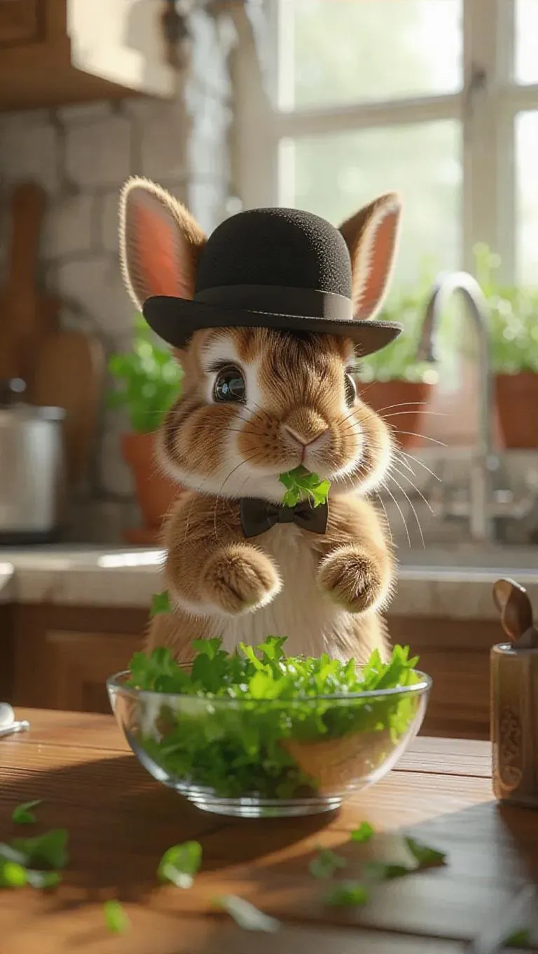 Text to ImageMiniature baby bunny 3D realistic, golden fur with floppy ears, wearing a bowler hat, in a cozy kitchen, tossing a salad in a glass bowl, surrounded by fresh greens, he is in his area, radiating freshness and vitalityRecreate