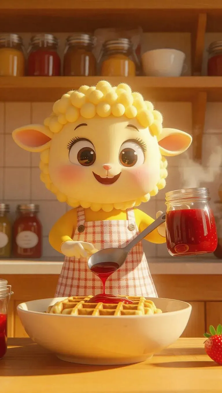 A cartoonish pastel yellow lamb in an apron stands at a large bowl, pouring thick strawberry syrup over cooked waffles, steam rising sweetly. It stirs with a playful spatula, ensuring every piece is perfectly coated, creating a delightful aroma. Cheerful, sunny kitchen, shelves filled with jars of jams and jellies