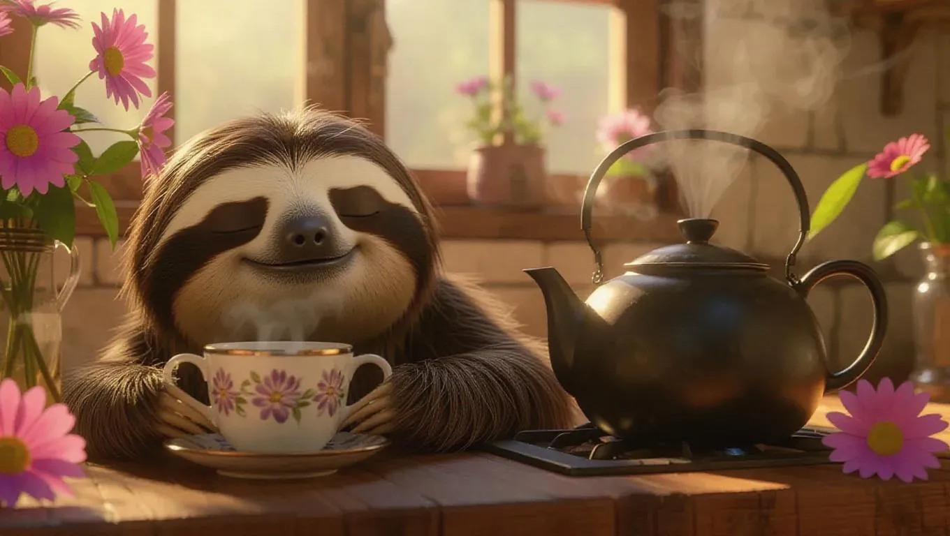 The cute cartoon fluffy sloth lounges next to a steaming kettle, brewing fragrant herbal tea with a cozy tea set. Its relaxed expression and fresh flowers around create a soothing kitchen atmosphere. The camera gradually shifts from the sloth’s content face to the bubbling kettle, illustrating the calming steam and the sloth’s gentle movements.