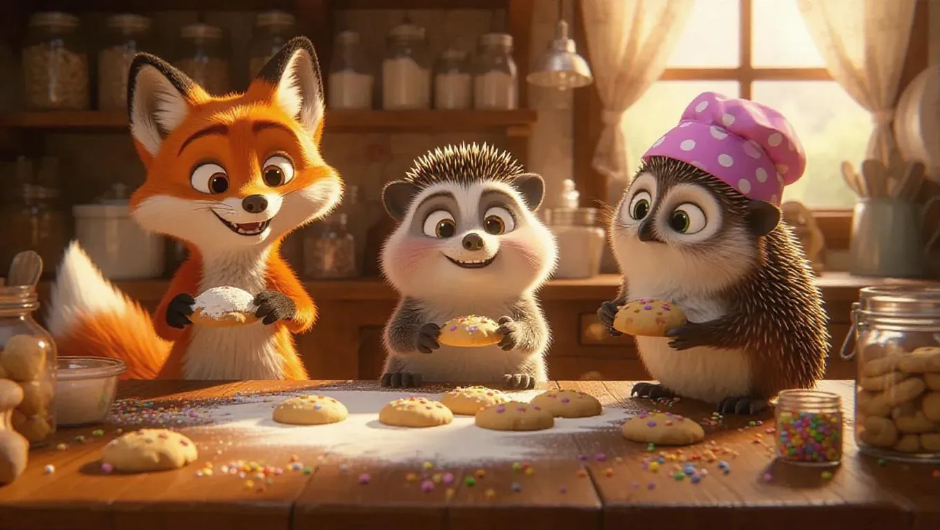 A whimsical bakery scene featuring a fox, hedgehog, and owl baking together. The fox expertly rolls out dough for scones, the hedgehog meticulously weighs sugar, and the owl decorates cookies with intricate designs. Vintage wooden tables, colorful sprinkles, and charming baker’s caps. Warm, inviting atmosphere with playful details like a cookie stuck to the ceiling and the owl sneaking a taste. Animals exude joy and focus