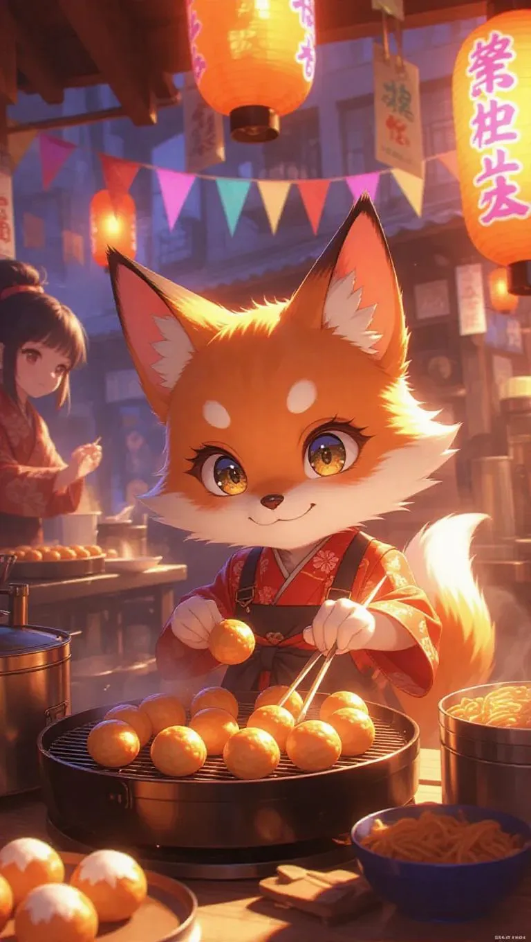 A mischievous little kitsune with a vibrant orange and white coat, sly twinkling eyes, found in a lively festival food stall kitchen. Preparing takoyaki and yakisoba, surrounded by colorful banners, paper fans, steaming griddles, and glowing lanterns, creating a festive and magical atmosphere