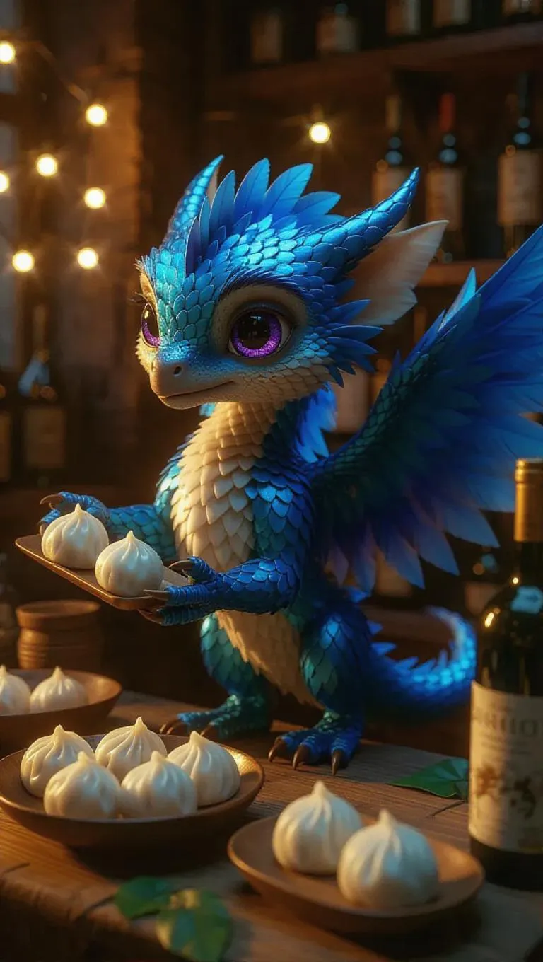The playful little griffin with sapphire blue and golden feathers and bright violet eyes beats its wings softly, generating a light wind that causes the fairy lights to shimmer. It prepares spring rolls and molds rice balls with meticulous skill, its actions fluid and graceful. The camera transitions gently from the griffin’s wings to the charming and modern touches of the inviting kitchen, incorporating clay bowls, wine bottles, and floating emerald leaves, emphasizing the lovely fusion of the magical and the ordinary.