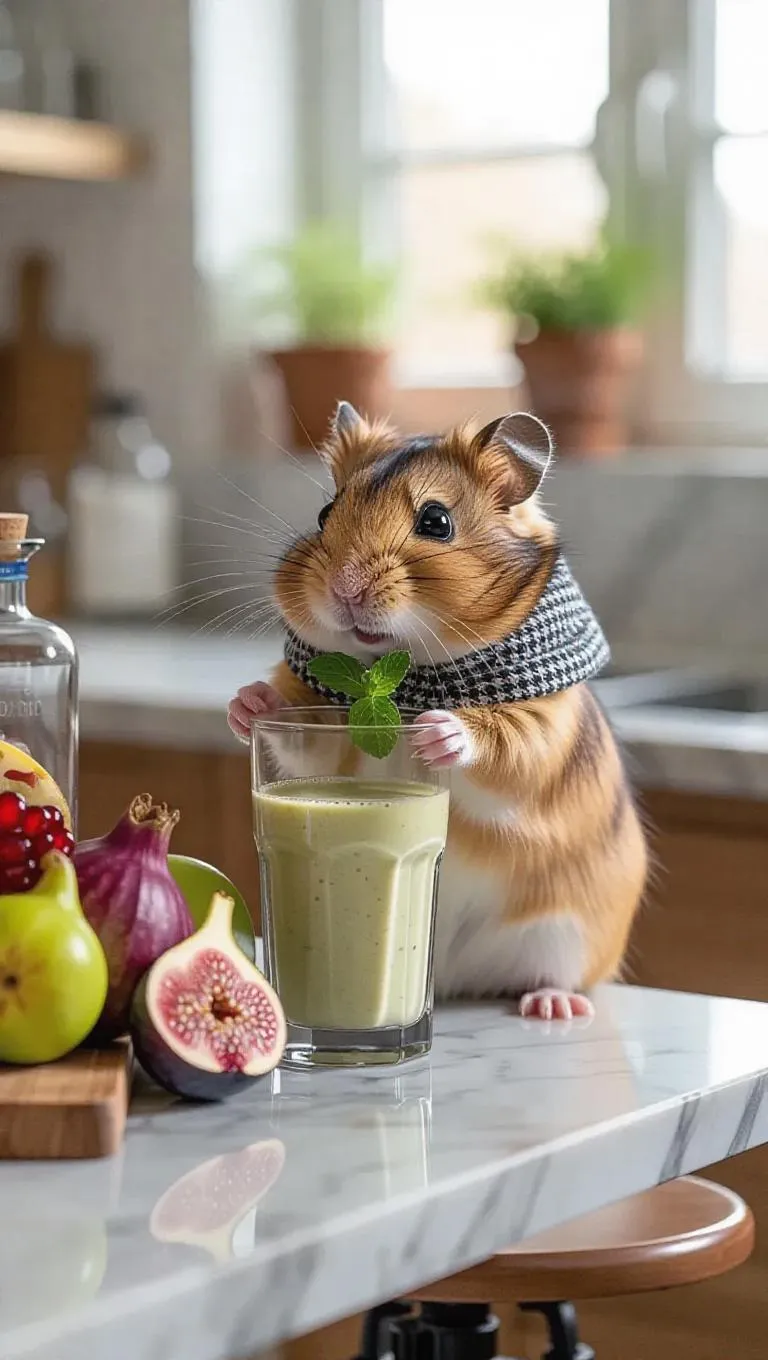 A stylish hamster is blending a chic smoothie in a trendy, urban kitchen. The hamster is wearing a tiny scarf and using a blender to mix fresh fruits like figs, guavas, and pomegranates. On the counter, there are additional fruits and a bottle of elderflower syrup. After finishing the smoothie, the hamster sits on a sleek barstool with a glass of smoothie in front of it, sipping fashionably.