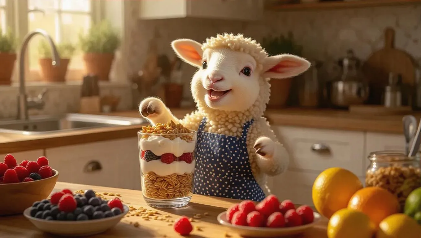 A cheerful lamb, wearing a cute apron, is whipping up a light yogurt parfait in a sunny kitchen. Using its hooves, it layers granola, berries, and yogurt in a glass. The table is filled with more toppings and fresh fruits. Once done, the lamb bleats with joy, prancing excitedly as it enjoys the delicious parfait.