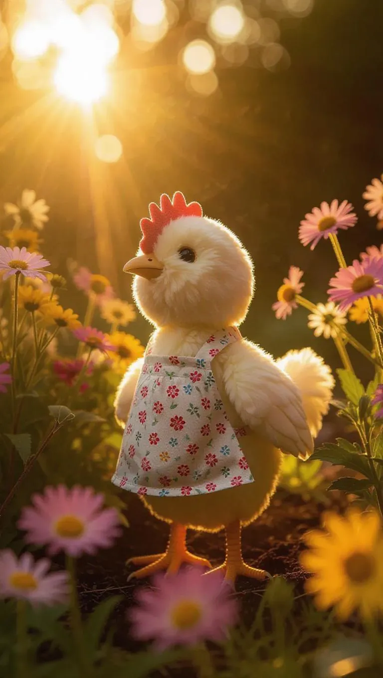 A fluffy, cute hen in a Jellycat style, wearing a delicate apron, stands confidently as it admires the garden. The hen's soft and warm feathers, with curious and lively eyes, shine in the colorful country garden. Sunlight streams through the trees, casting a warm, golden glow that illuminates every flower, creating a serene and harmonious atmosphere. Style: Adorable realism.