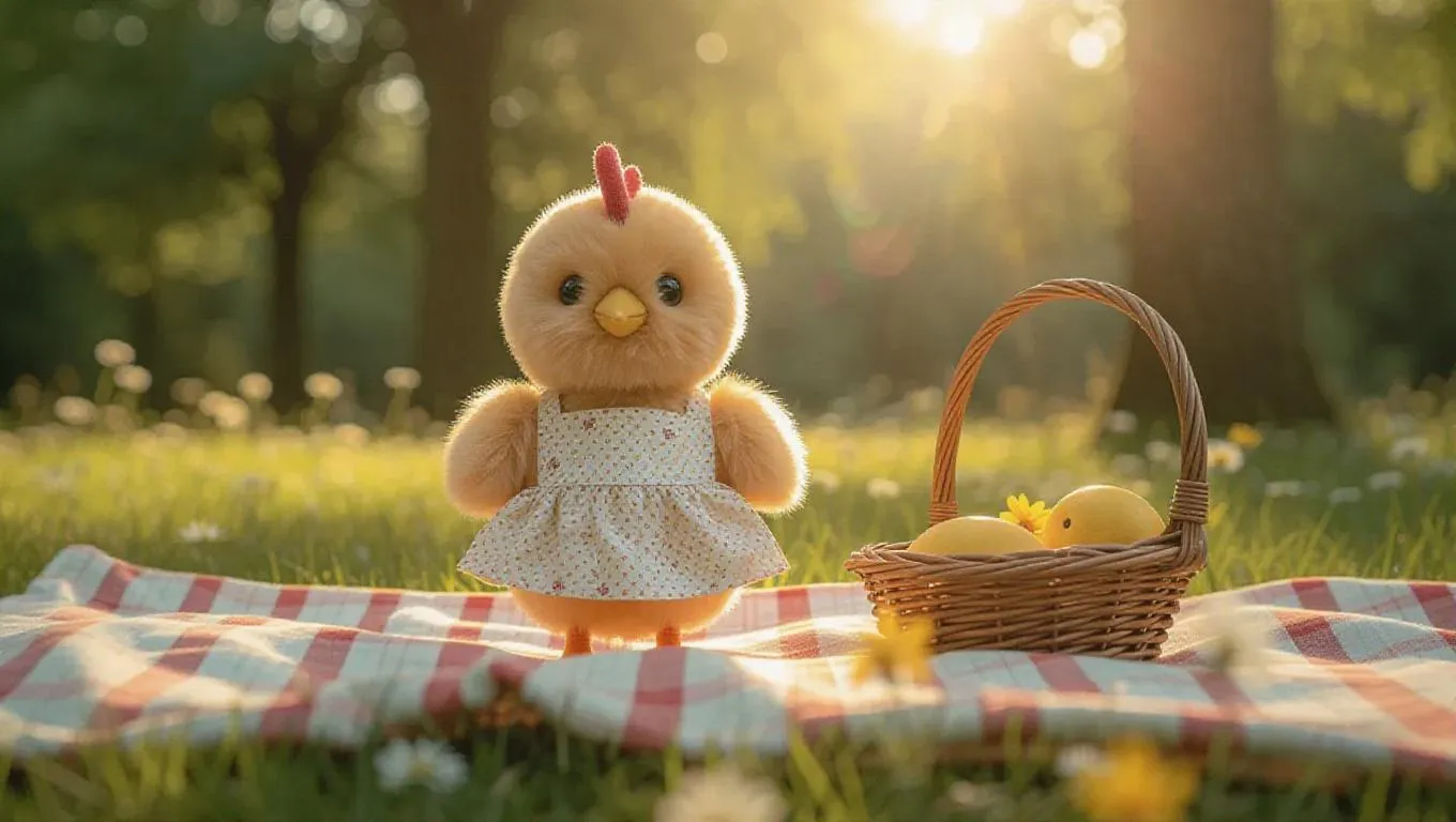 A fluffy, cute hen in a Jellycat style, wearing a delicate apron, stands confidently on a picnic blanket. The hen's soft and warm feathers, with curious and lively eyes, shine in the sunny park. A gentle breeze carries the scent of flowers, creating a cheerful and vibrant atmosphere. Style: Adorable realism.