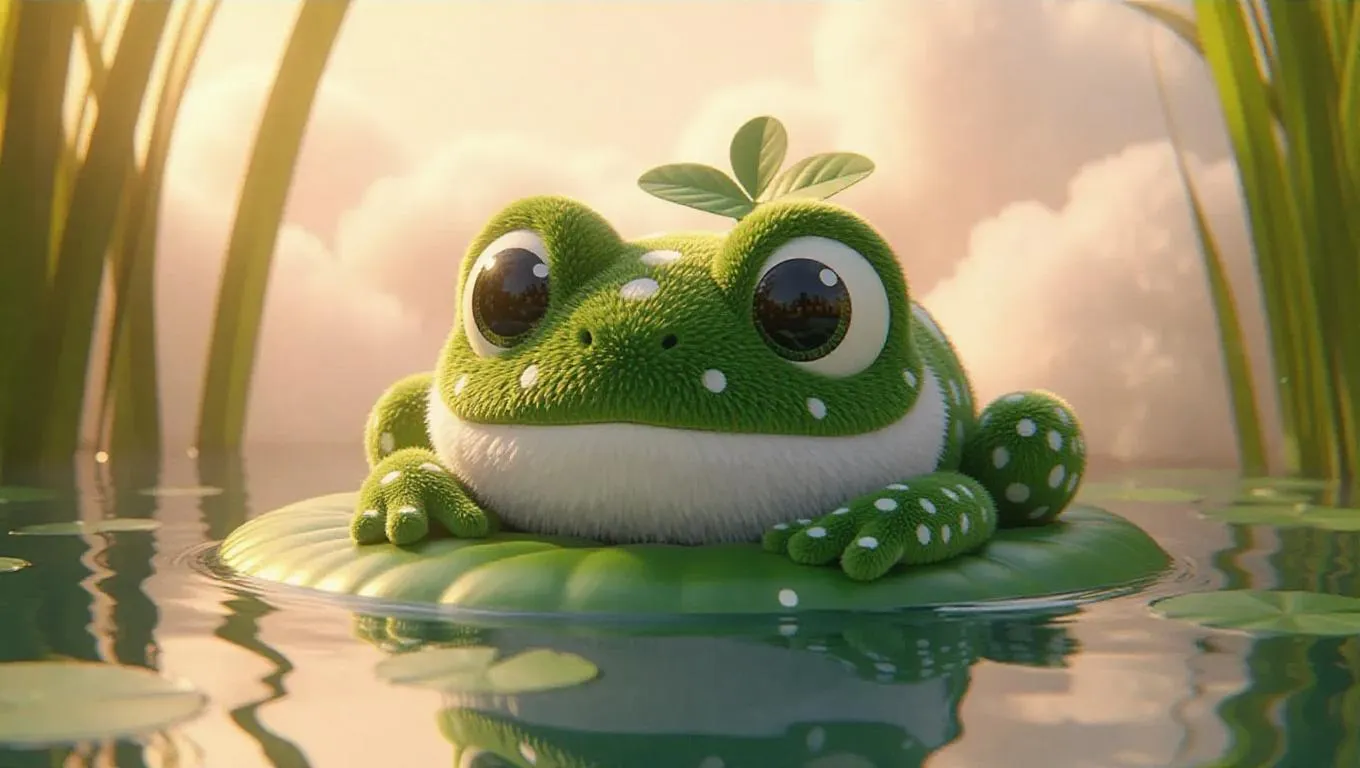 A fluffy, Jellycat-style frog with soft, rounded edges and large, expressive eyes. Its body is covered in plush, green fur, with white spots and a tiny, adorable lily pad on its back. Resting in a cozy, pastel-colored pond, under a gentle cloud. Soft, warm sunlight filters through the reeds, casting gentle shadows and highlighting the frog's cuddly texture. The scene exudes a playful, whimsical charm, perfect for a children's storybook.