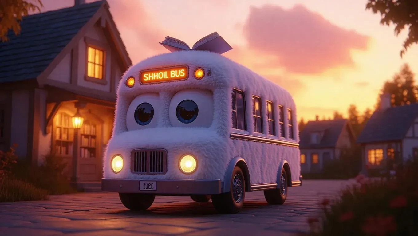 A fluffy, Jellycat-style school bus with soft, rounded edges and large, expressive eyes is parked in front of a cozy little bookstore in a quaint village. Its body is covered in plush, soft gray fur, with white paws and a tiny book on top of the bus. The sky above is filled with orange and pink hues of sunset, while warm lights spill from the bookstore windows, creating a welcoming glow. The scene feels inviting and magical, perfect for a children's tale about reading.