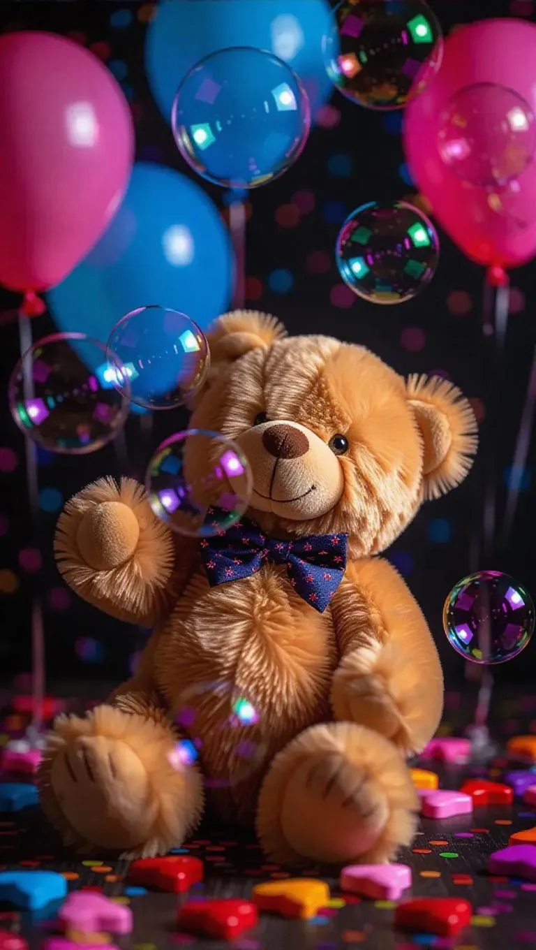 A cute teddy bear wearing a tiny bowtie, a perfect Valentine’s gift, blows star-shaped bubbles, each filled with joy and happiness. Vibrant balloons float in the background, adding a celebratory and cheerful touch to the scene, enhancing the sense of excitement and fun.