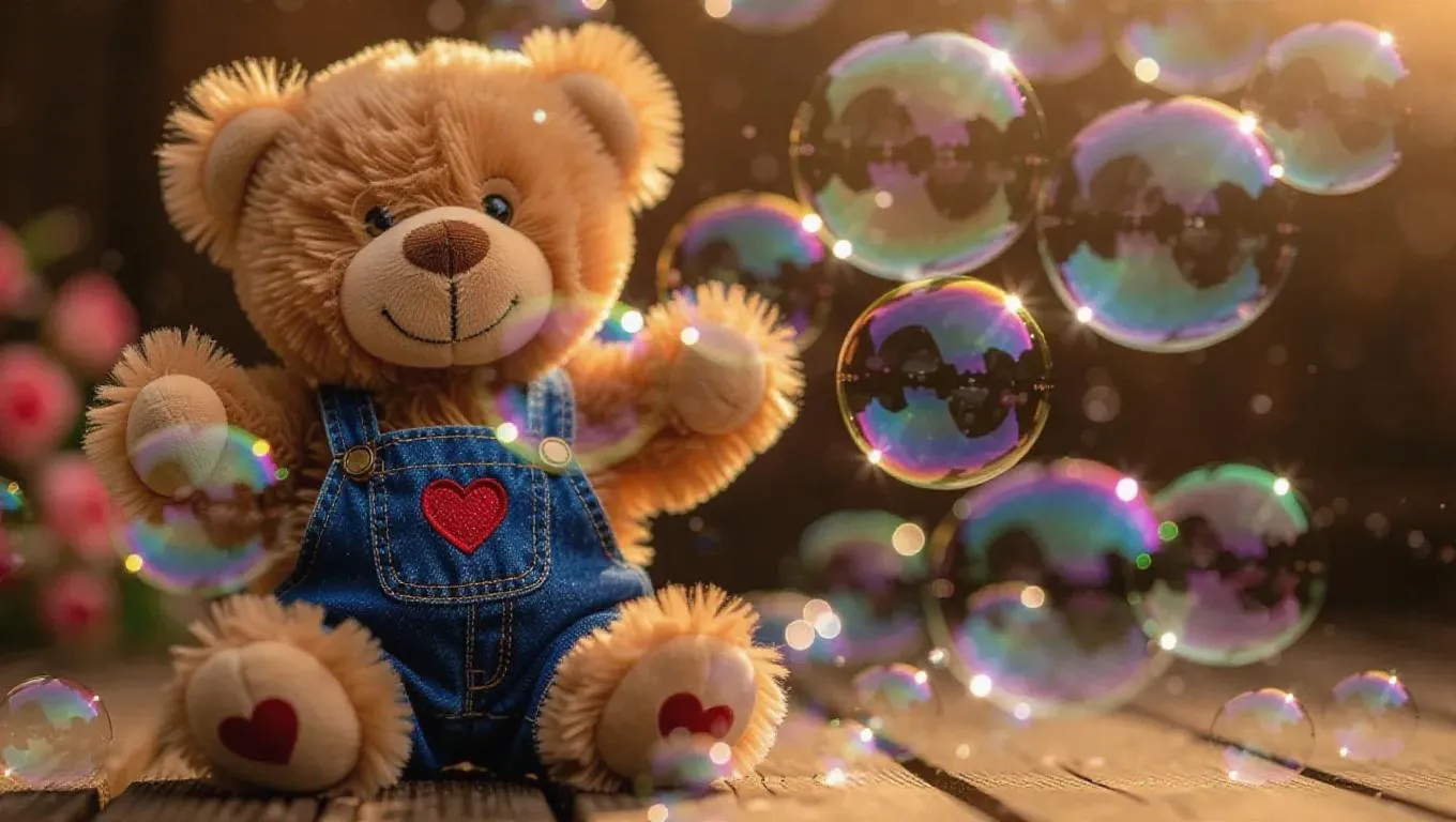 A quirky teddy bear wearing denim overalls, a perfect Valentine’s gift, blows multi-colored bubbles, each filled with laughter and fun. Cartoon characters float in the background, adding a humorous and playful touch to the scene, enhancing the feeling of joy and lightheartedness.