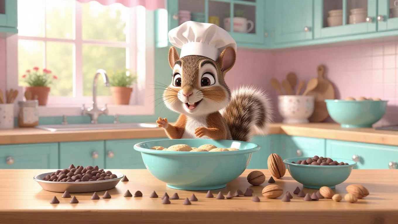 A curious cartoon squirrel wearing a tiny chef's hat, baking cookies in a large bowl on a wooden kitchen counter. The squirrel is surrounded by chocolate chips, nuts, and a small mixing bowl. The kitchen is bright and cheerful, with pastel walls and a large window showing a sunny patio outside. The squirrel looks joyous and a bit messy, with dough on its face. The counter is decorated with cookie sheets.