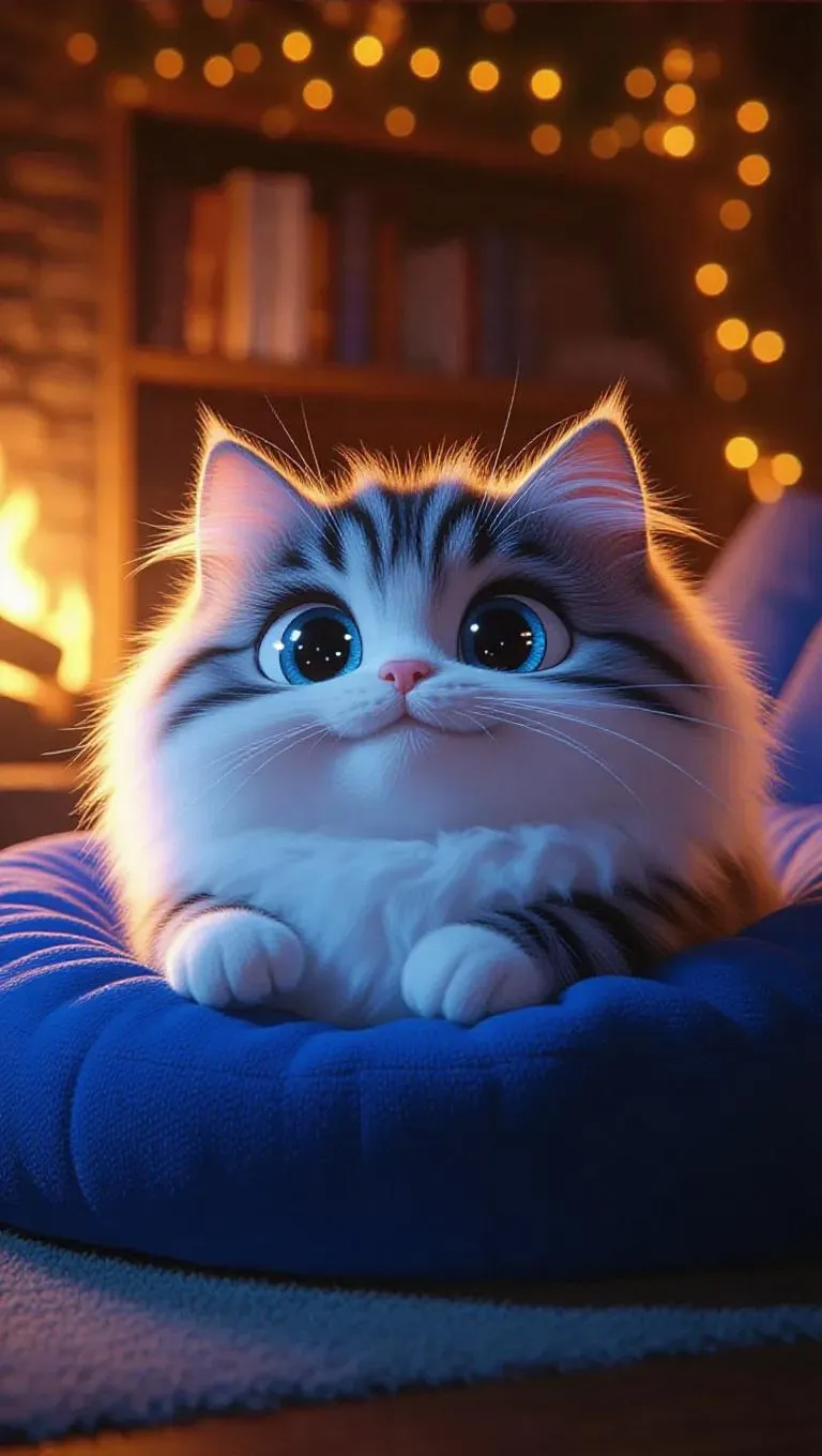An endearing, oversized cat with sparkling eyes and a playful grin, enveloped by a mass of fluffy cloud-like fluff, creating a whimsical, light-hearted ambiance. The backdrop is a cozy, plush home featuring oversized bean bags and a softly glowing fireplace. The style is inspired by digital art, with smooth textures and bright, vibrant colors.