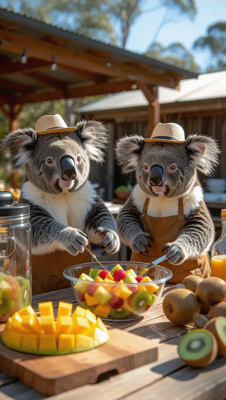 Ultra-realistic koalas in an open-air kitchen, each adorned with sunhats and stylish aprons, masterfully preparing a vibrant fruit salad. Surrounded by modern outdoor appliances like a portable blender and a rustic picnic table, fresh ingredients like mango, kiwi, and berries are artfully arranged. The scene exudes culinary artistry and anthropomorphic charm, capturing the koalas' energetic and joyful interactions.