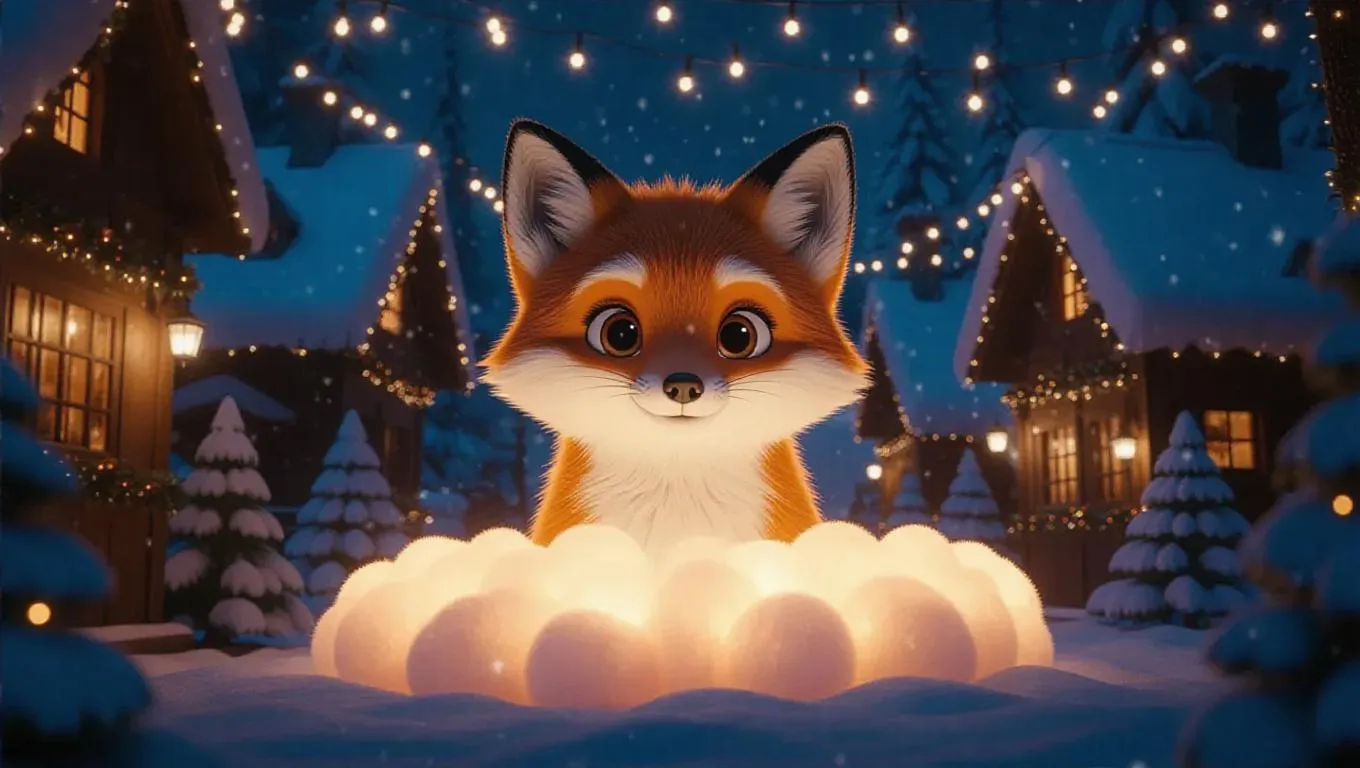 A soft, oversized fox with sparkling eyes and a gentle smile, surrounded by a cloud of glimmering, fluffy fluff, creating a festive, whimsical atmosphere. The scene is set in a holiday village with oversized decorations and twinkling, fluffy lights. The style is influenced by traditional Japanese woodblock prints, with festive motifs and vibrant colors.