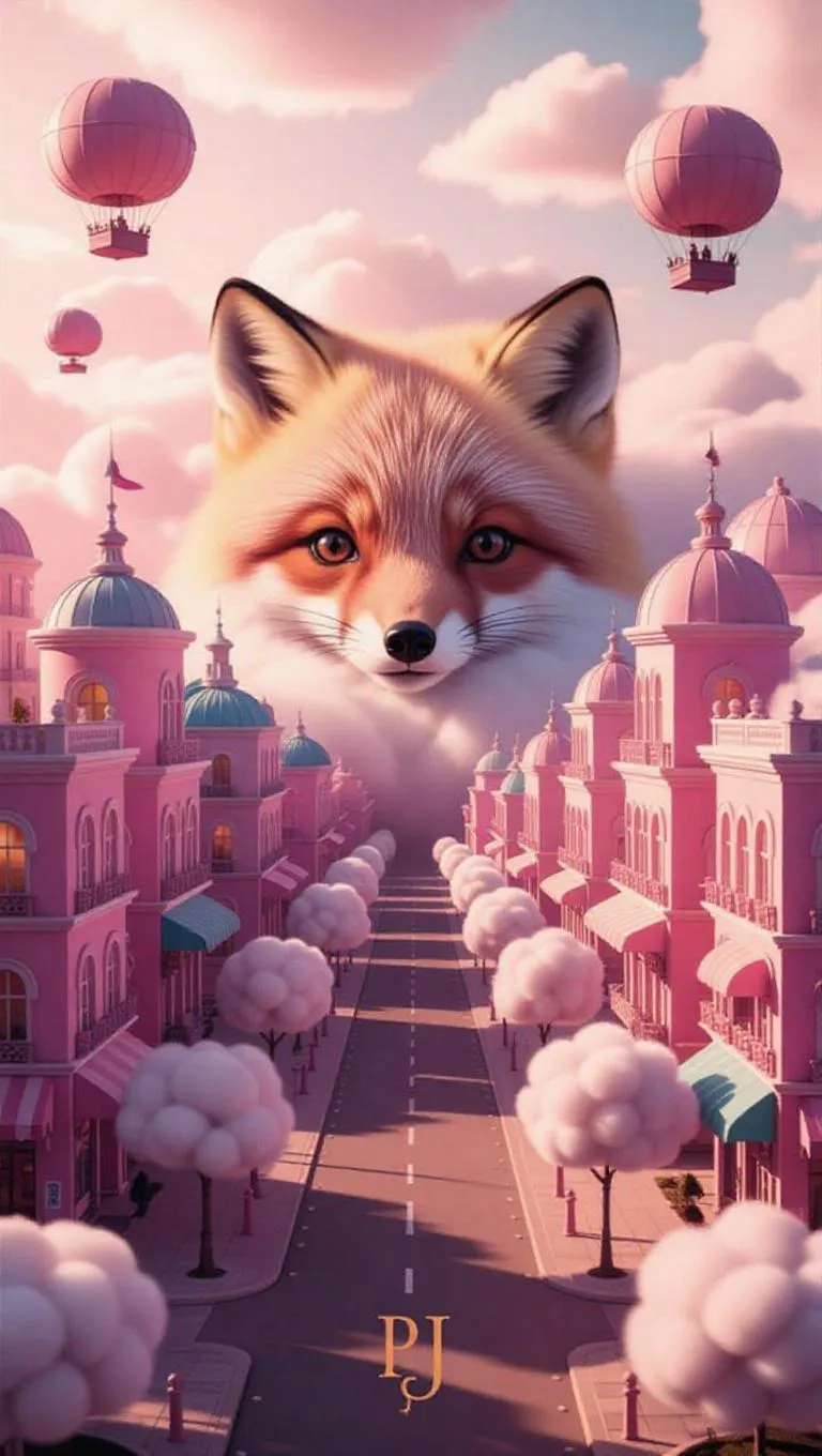 A pastel-colored cityscape viewed from above, where buildings and streets subtly form a fluffy, adorable fox. The city features soft, cloud-like structures and rounded, bubble-like buildings. Floating cotton candy trees line the streets, and the roads are paved with marshmallow-like tiles. Warm golden light casts a soft, magical haze, enhancing the whimsical and kawaii aesthetic. Airships shaped like plush animals gently float in the sky, contributing to the ultra-detailed, cinematic composition that balances realism and fantasy, evoking wonder and comfort. The style is reminiscent of a children's storybook illustration, with whimsical details and a playful tone.