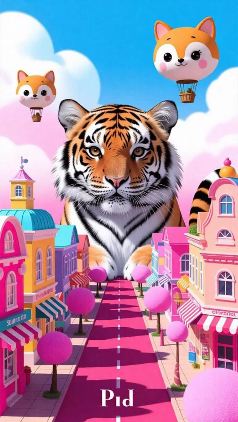 A pastel-colored cityscape viewed from above, where buildings and streets subtly form a fluffy, adorable tiger. The city features soft, dreamy structures and rounded, bubble-like commercial buildings. Floating candy floss trees line the streets, and the roads are paved with biscuit-like tiles. Warm coral light casts a soft, magical haze, enhancing the whimsical and kawaii aesthetic. Airships shaped like plush foxes gently float in the sky, contributing to the ultra-detailed, cinematic composition that balances realism and fantasy, evoking wonder and comfort. The style is reminiscent of a children's storybook illustration, with whimsical details and a playful tone.