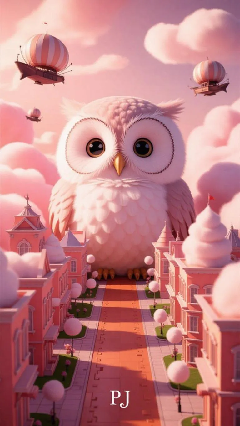 A pastel-colored cityscape viewed from above, where buildings and streets subtly form a fluffy, adorable owl. The city features soft, cloud-like structures and rounded, sugar cube-like buildings. Floating cotton candy moons line the streets, and the roads are paved with caramel-like tiles. Warm peach light casts a soft, magical haze, enhancing the whimsical and kawaii aesthetic. Airships shaped like night creatures gently float in the sky, contributing to the ultra-detailed, cinematic composition that balances realism and fantasy, evoking wonder and excitement. The style is reminiscent of a children's storybook illustration, with whimsical details and a playful tone.