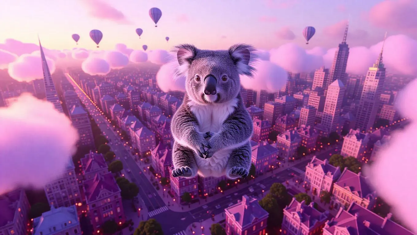 A pastel-colored cityscape viewed from above, where buildings and streets subtly form a fluffy, adorable koala. The city features soft, cloud-like structures and rounded, jellybean-like buildings. Floating cotton candy mist lines the streets, and the roads are paved with toffee-like tiles. Warm lavender light casts a soft, magical haze, enhancing the whimsical and kawaii aesthetic. Airships shaped like eucalyptus trees gently float in the sky, contributing to the ultra-detailed, cinematic composition that balances realism and fantasy, evoking wonder and cuddles. The style is reminiscent of a children's storybook illustration, with whimsical details and a playful tone.