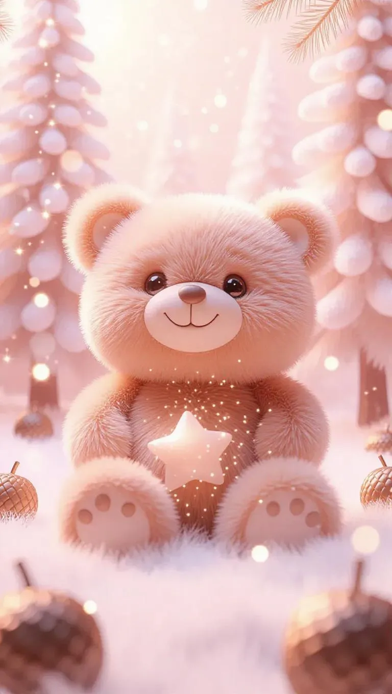 A chubby, oversized teddy bear with cheerful eyes and a sweet smile, surrounded by a fog of glittering stars, creating a whimsical, dreamlike atmosphere. The setting has a soft, fluffy forest with cotton-candy-like trees and fluffy, oversized acorns. The style is inspired by clay modeling, with textured surfaces and rich colors.