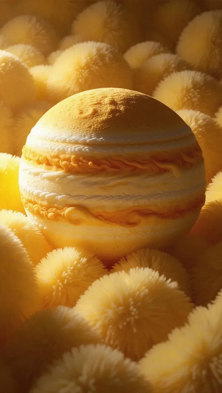 A whimsical depiction of Venus in Jellycat style, where the planet is rendered as a giant, fluffy ball of soft, yellowish fur. The thick clouds are depicted as plush layers, and the surface features are velvety and soft. The entire scene is bathed in soft, golden light, creating a dreamy and inviting atmosphere. The style is playful and cuddly, perfect for a children's book or a cozy home decor piece.