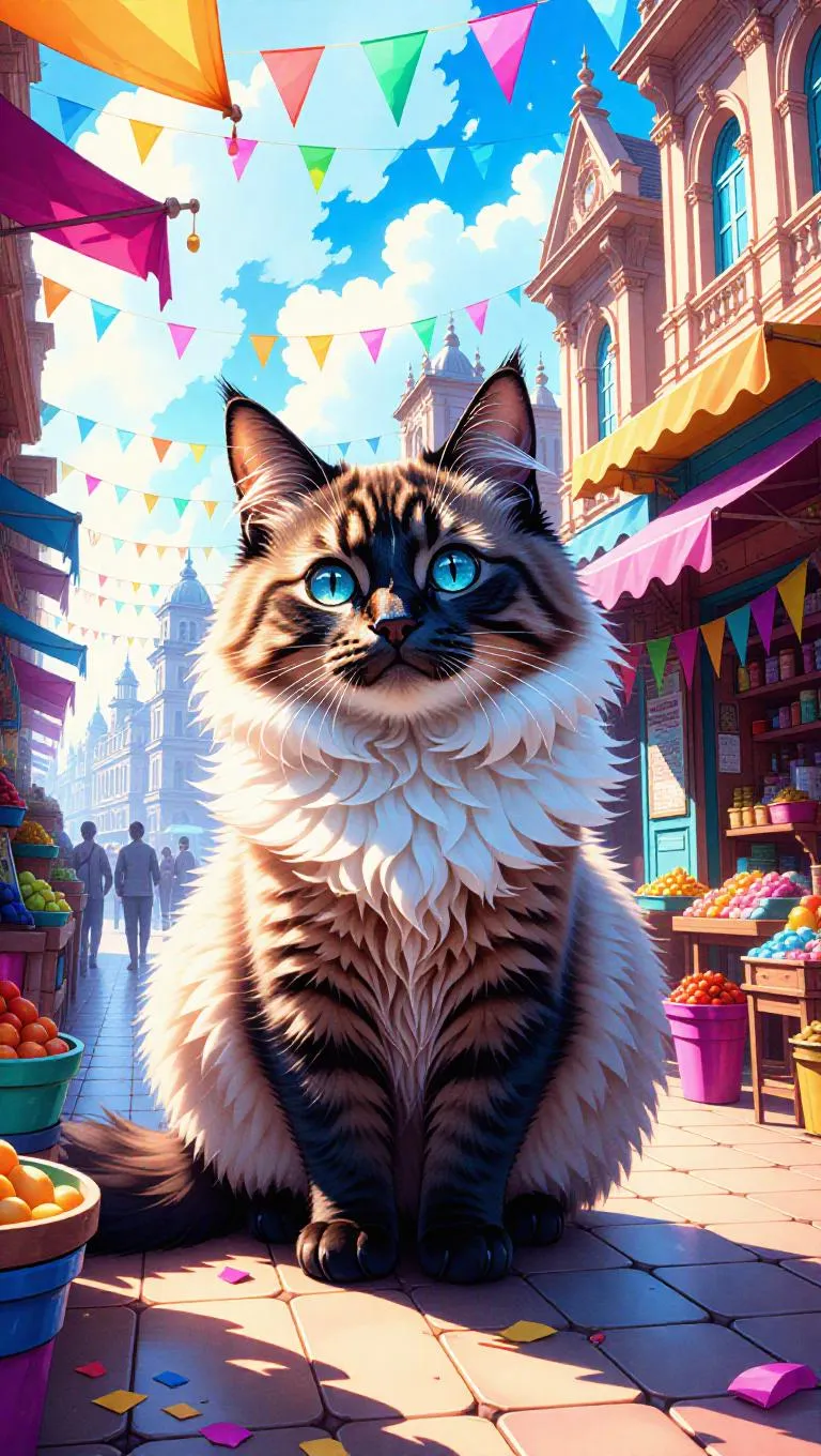 Watercolor portrait of a fluffy Mumbai, vibrant hues blending seamlessly, capturing the whimsical charm of local markets, Victorian buildings, and the Arabian Sea, framed by colorful stalls and a sunny sky in a toy-like world.
