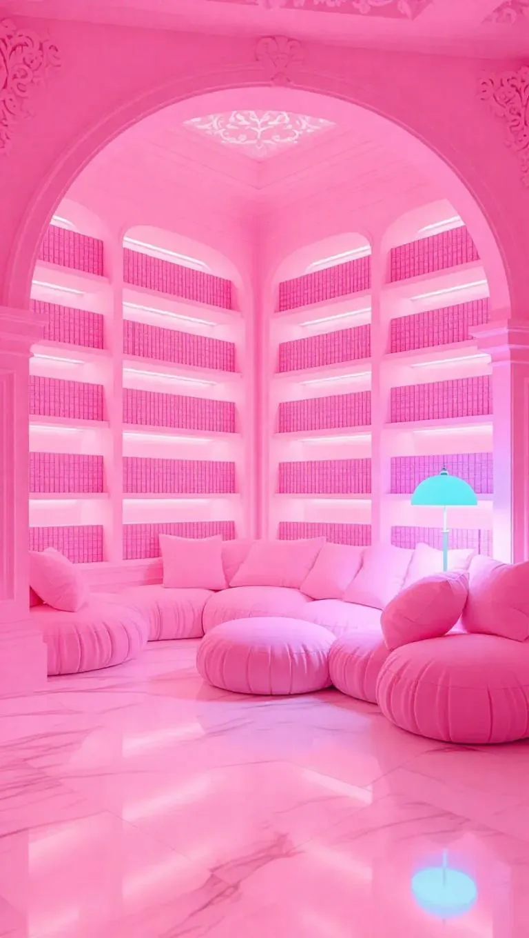 A whimsical pink world where a library is filled with books that glow in soft pink light. The shelves are made of pink marble, and the walls are adorned with pink tapestries. A cozy reading nook in the corner is filled with plush pink cushions and a cool blue lamp.