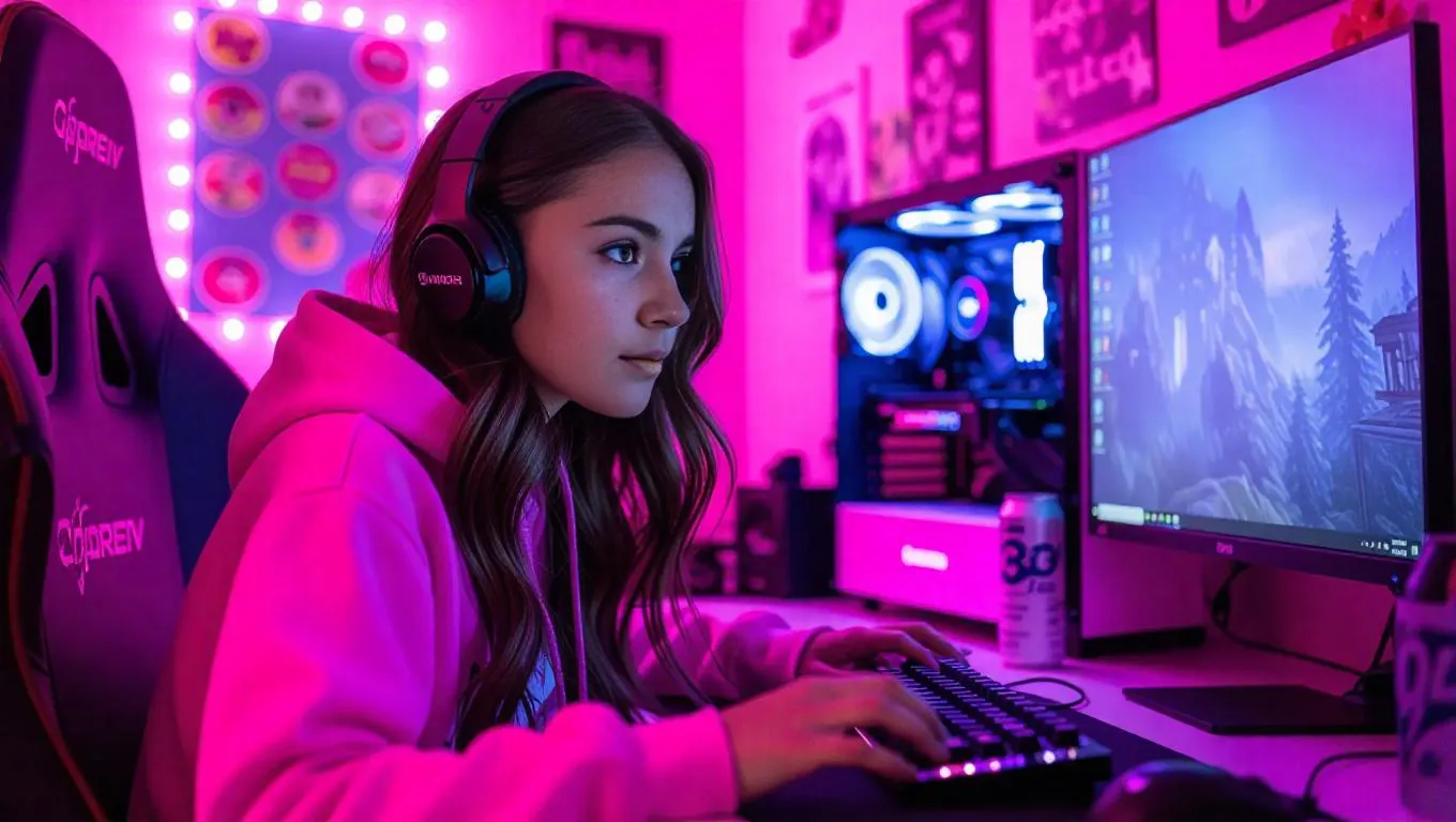 A 25-year-old American girl in a bright pink hoodie, surrounded by a vibrant pink room adorned with colorful gaming-themed furniture and stickers, intensely focused on playing video games on her sturdy computer setup, with a wide screen displaying vivid graphics and energy drinks nearby.