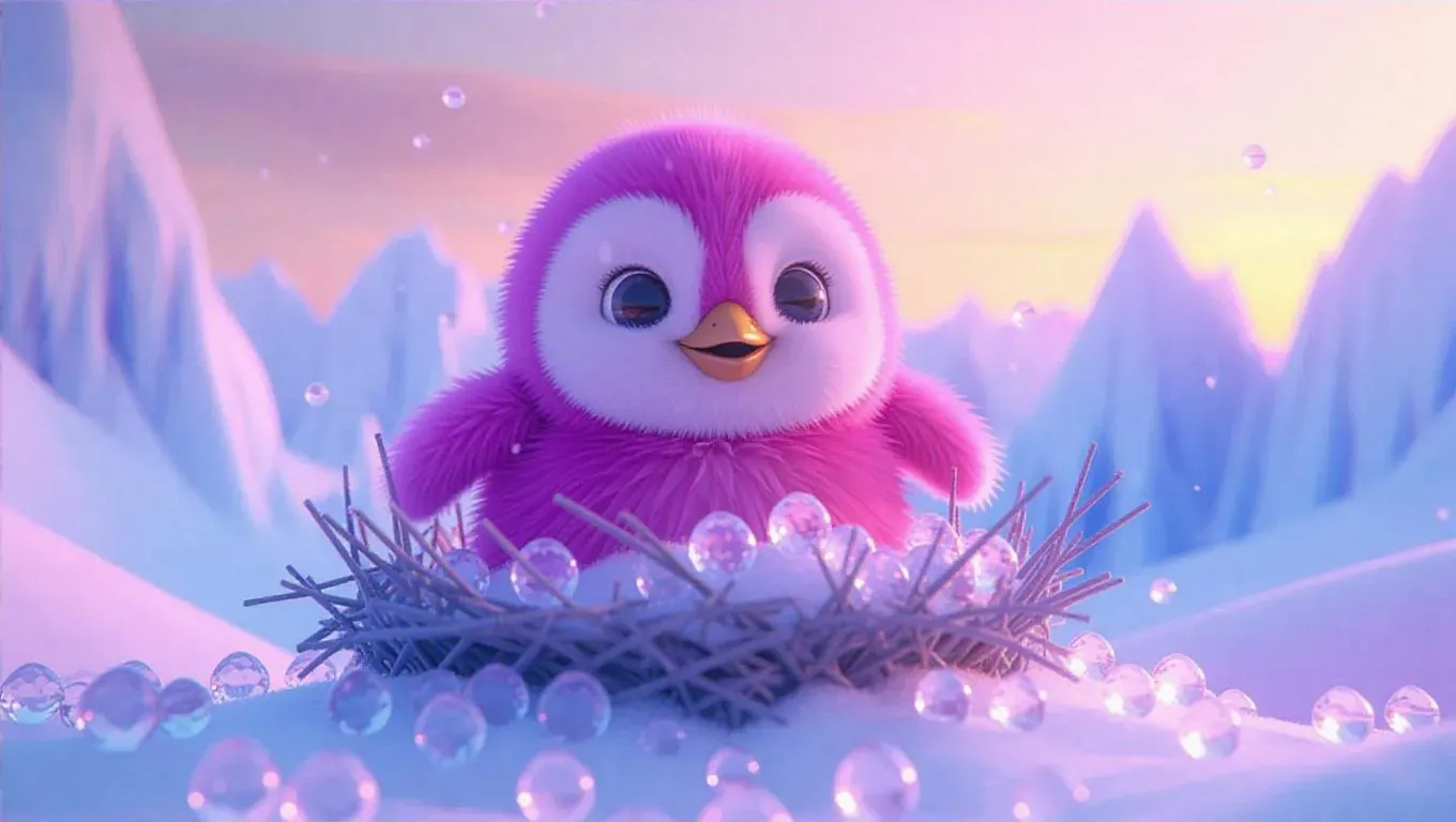 A 3D-cartoon-style cute bubblegum-pink penguin hatchling emerges from a whimsical nest carved from frosted pomelo ice crystals. Dawn paints the Antarctic sky in amethyst hues, casting long magenta shadows across glaciers embedded with crushed diamond deposits. The chick's fluffy plumage shifts from blush to fuchsia tones as it waddles through snowdrifts shimmering with pink diamond dust, each step activating