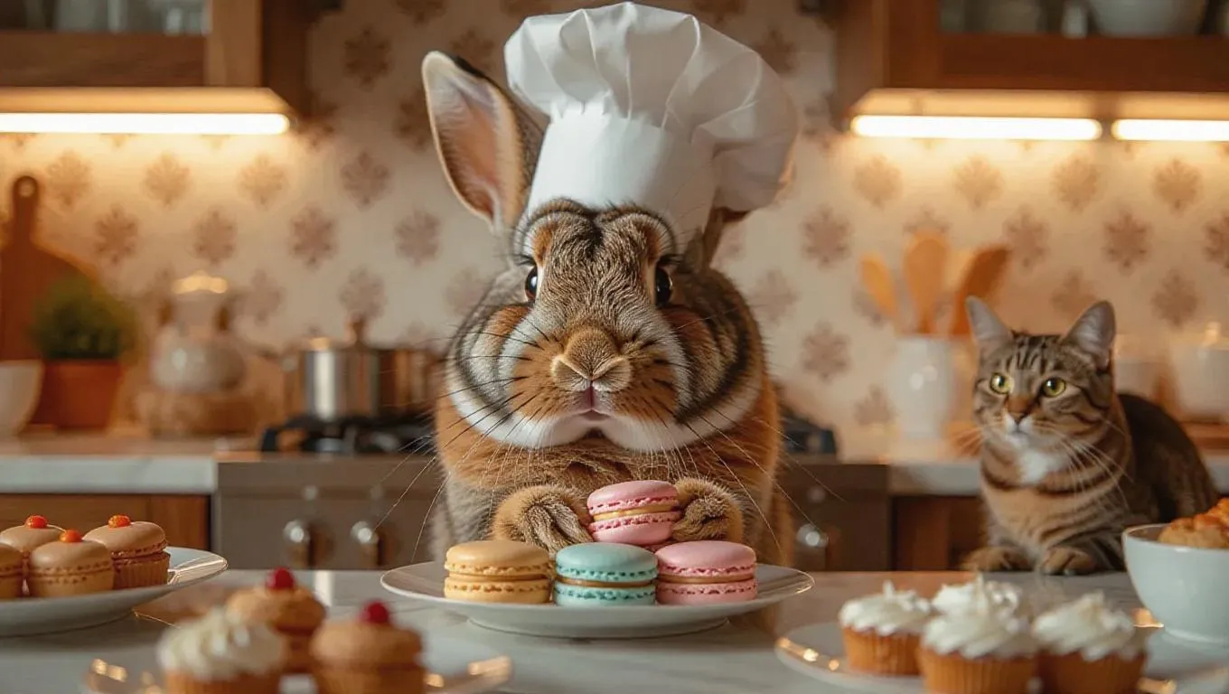 Animal chefs in a stylish, chic kitchen. Fashionable rabbit wearing a trendy chef hat, baking macarons. Elegant tiles, refined light glowing throughout. Stylish cat setting the table, bird arranging the desserts. High-end pastries, gourmet dishes, chic snacks. Classy, fashionable, upscale, elegant mood.