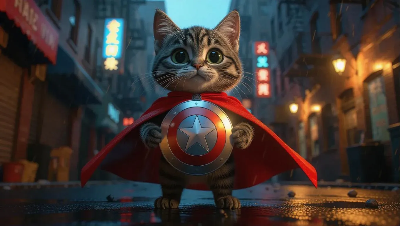 A 3D cat image dressed as a superhero in a cape, standing upright on two legs like a human, holding a shield emblazoned with a symbol, surrounded by cityscape and crime-fighting tools, exuding a heroic and innovative atmosphere, with a spark of bravery in its eyes.