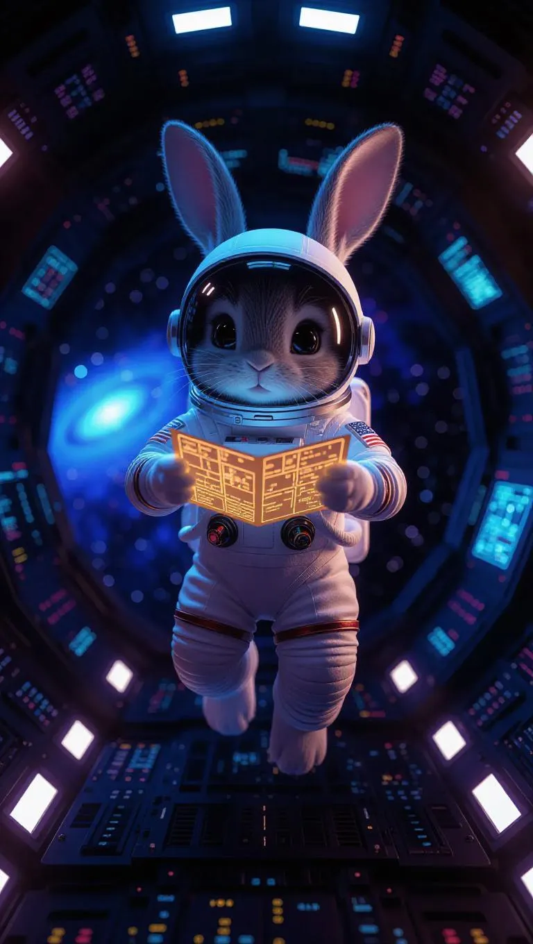 A 3D bunny in a sleek astronaut suit, floating in zero gravity, curiously holding a glowing space map. Surrounded by a futuristic spaceship interior with blinking panels, the bunny gazes out at a starry cosmos, exuding a curious and daring spirit.
