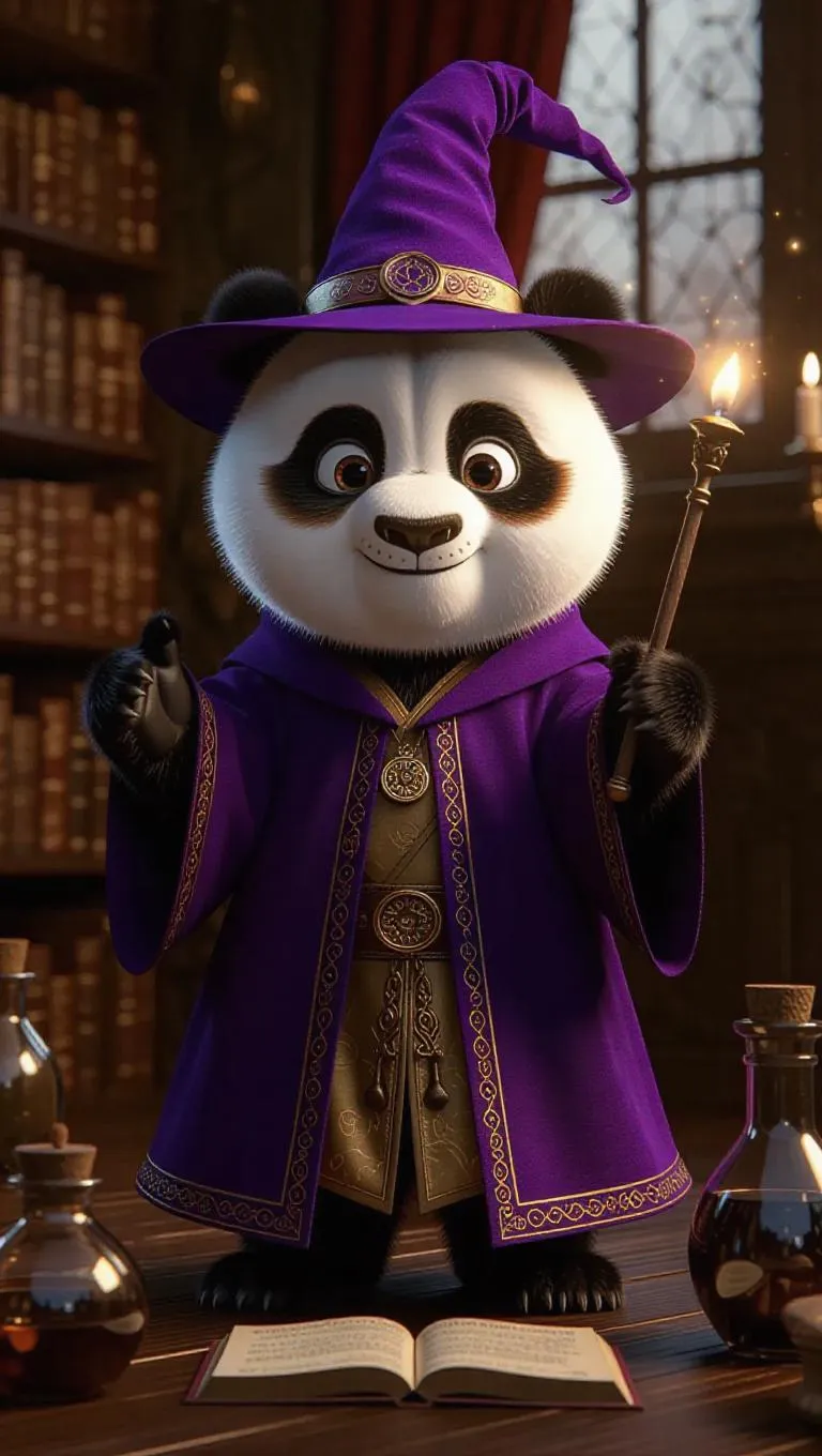 A 3D panda image wearing a wizard's robe and hat, standing upright on two legs like a human, holding a magic wand, surrounded by potions and spell books, exuding a magical and enchanting atmosphere.
