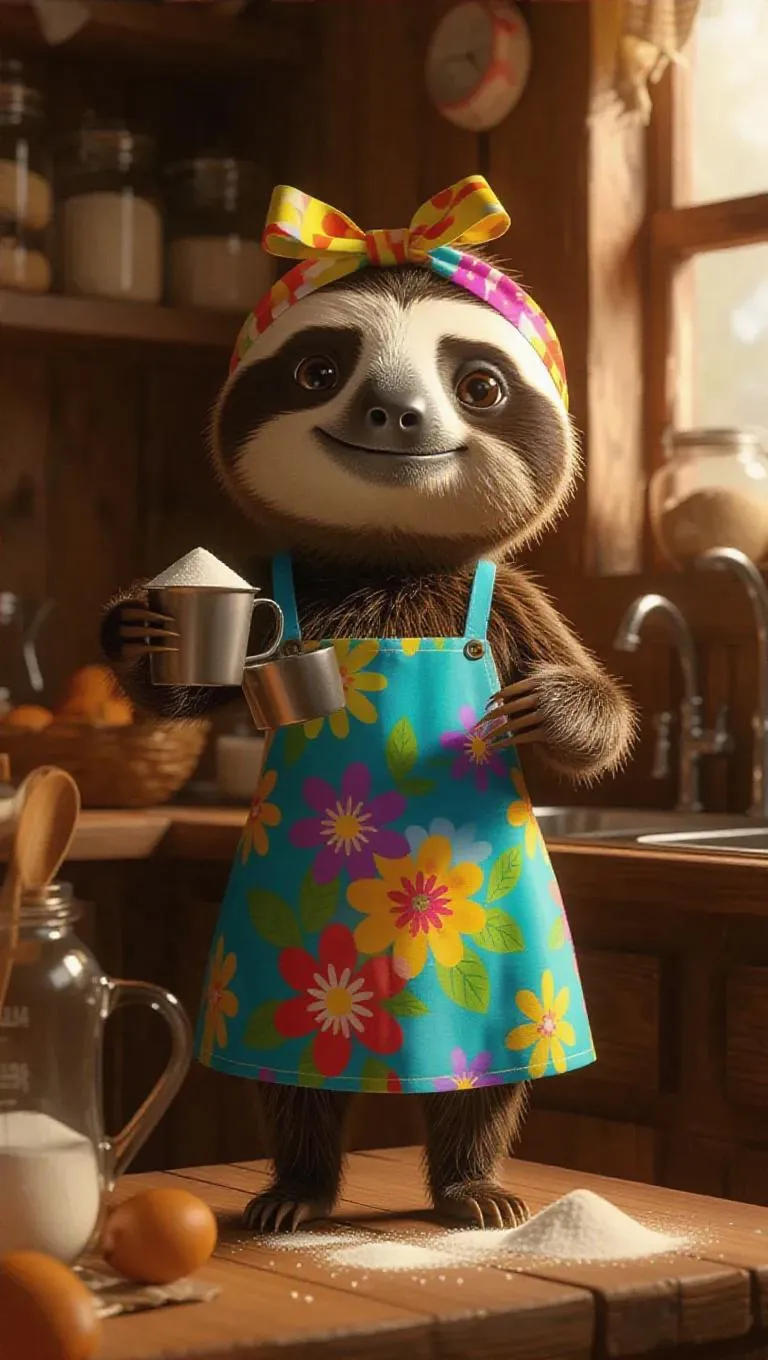 A 3D sloth image wearing a colorful apron and headband, standing upright on two legs like a human, holding a measuring cup and pouring sugar in a rustic, country kitchen, surrounded by ingredients and a wooden table, exuding a warm and inviting atmosphere.