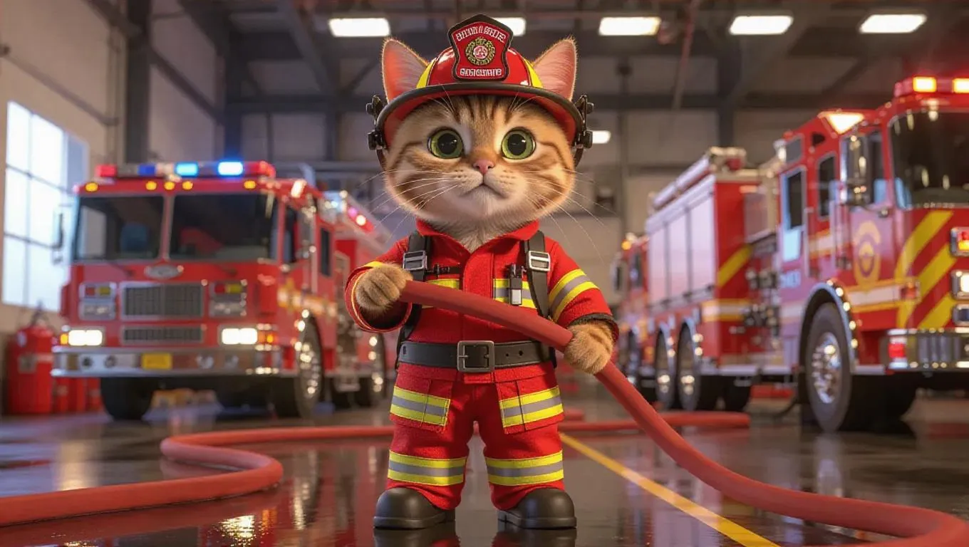 A 3D cat image wearing a fireman's gear and helmet, standing upright on two legs, holding a fire hose, surrounded by fire trucks and equipment in a firefighting station, exuding a brave and heroic aura.