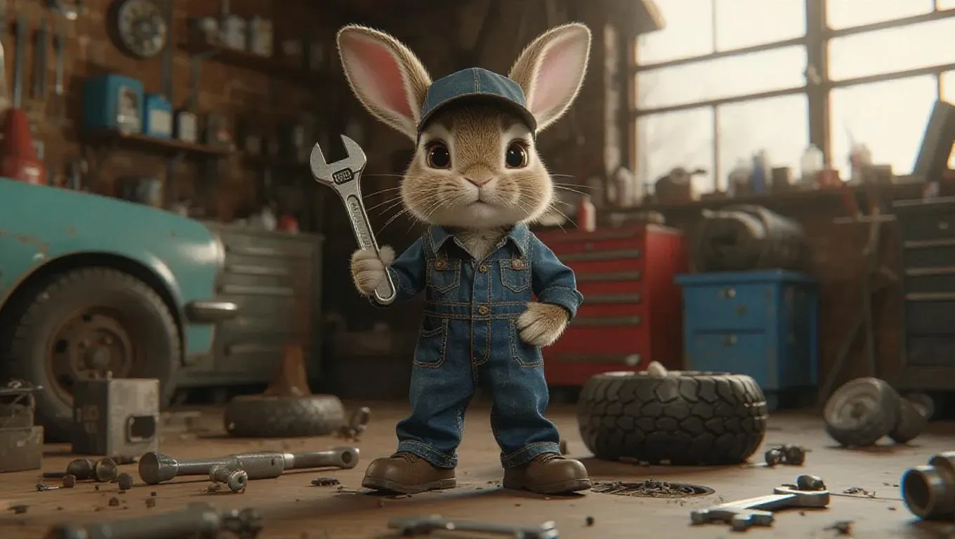 A 3D bunny in a mechanic's jumpsuit and cap, standing upright on two legs, holding a wrench with confidence. Surrounded by tools and car parts, the bunny exudes skill and craftsmanship in a garage setting, with a backdrop of vehicles and oil stains.