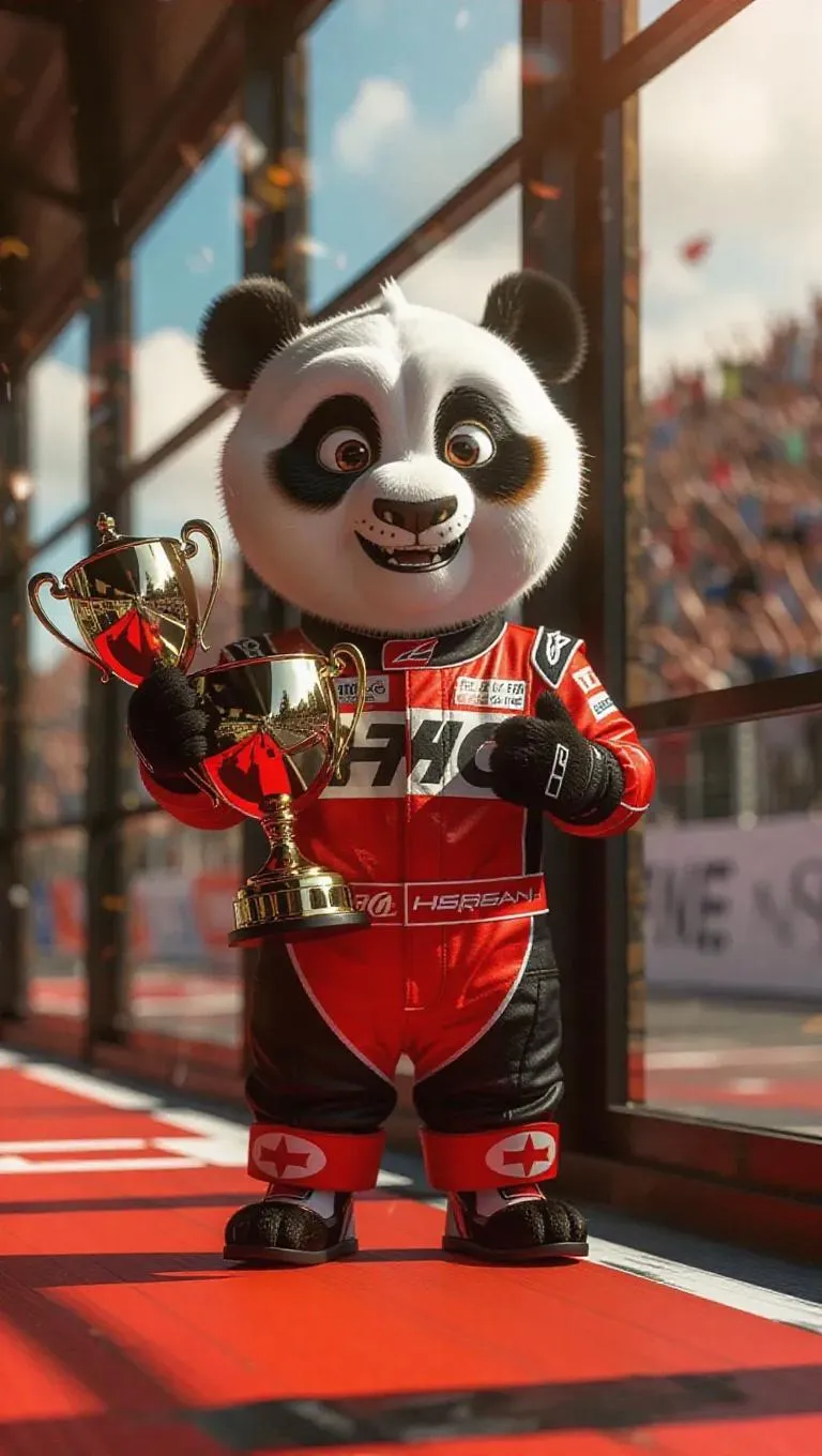 Text to ImageA 3D panda image wearing a racing suit, standing upright on two legs like a human, holding a trophy and a helmet, surrounded by a racetrack and a cheering crowd view through the window, exuding a competitive and thrilling atmosphere.Recreate