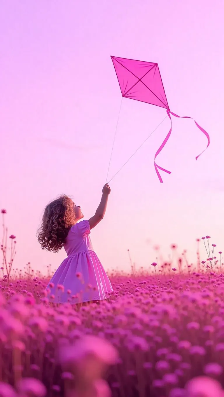 A delicate pink world where a little girl with curly hair is playing with a pink kite in a meadow. The sky is a soft lavender hue, and the kite is flying high above the field of pink flowers. The scene feels light and joyful.