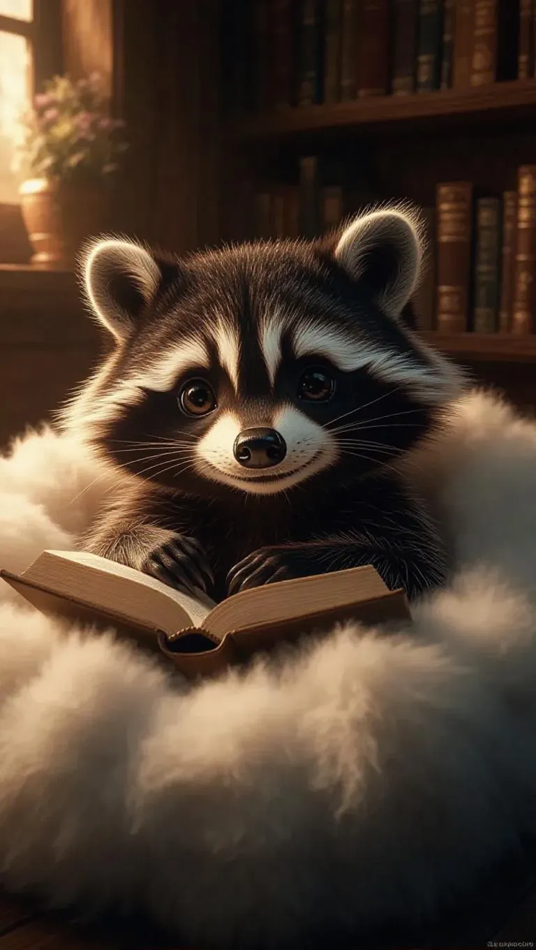 A soft, oversized raccoon with dreamy eyes and a content smile, surrounded by a cloud of velvety fluff, creating a calming, whimsical atmosphere. The scene is set in a tranquil, oversized library filled with fluffy, oversized books and reading corners. The style is reminiscent of an enchanting children’s book illustration, with a peaceful and inspiring feel.