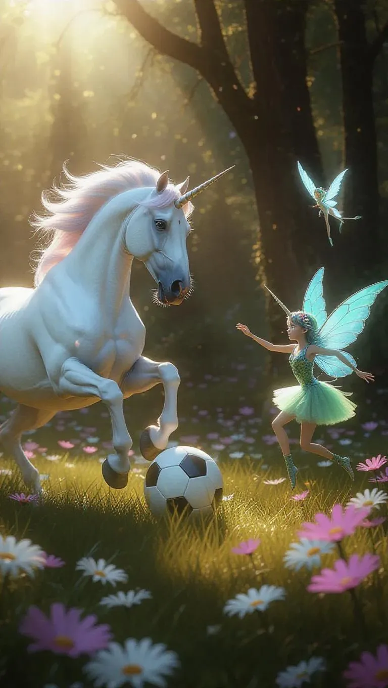 In a magical fairyland, a unicorn and a sprite are engaged in a fierce game of soccer. The unicorn prances with the ball, its mane shimmering with pastel colors, while the sprite flits around intercepting and passing with delicate grace. The flowers bloom brightly as the two animals compete fiercely, their determination evident in every move.