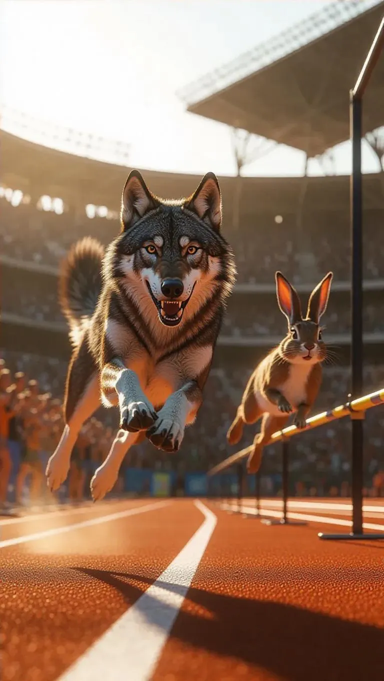 In a bustling sports stadium, a wolf sprints on a synthetic track, its fur glistening with sweat, while a hare bounds over high jump bars with incredible agility. The crowd cheers as the wolf and hare compete fiercely, their determination evident in every move.