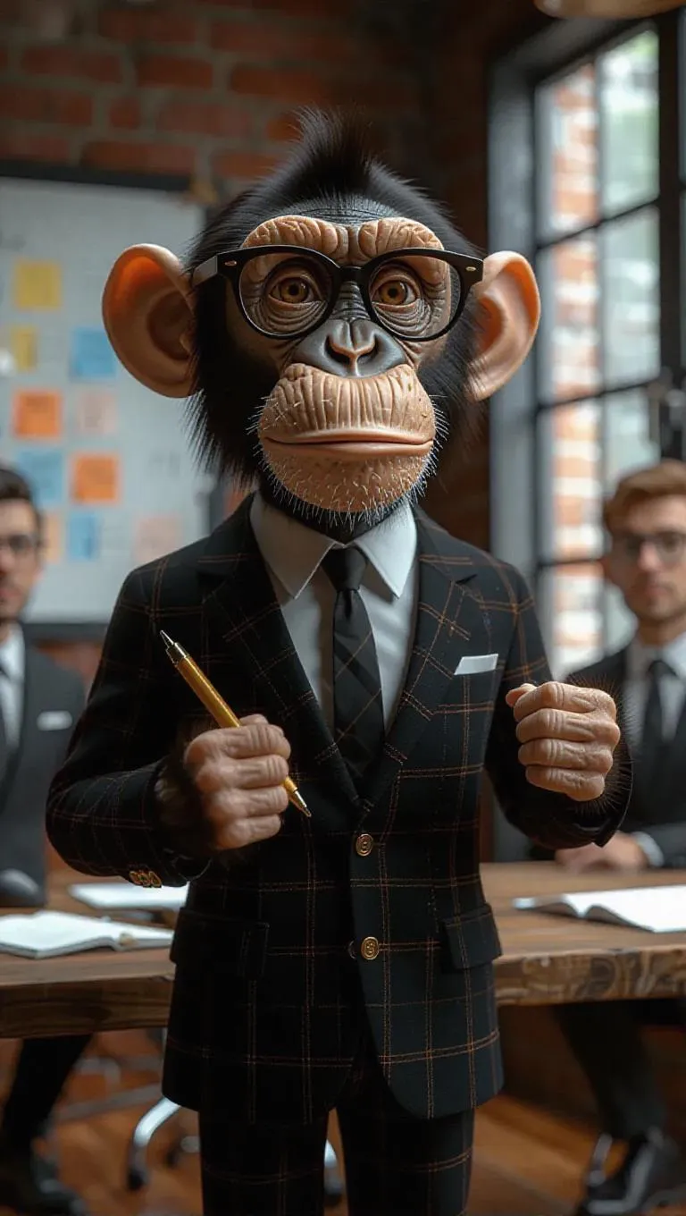 A 3D monkey image wearing a project manager's blazer and glasses, standing upright on two legs like a human, holding a pen and explaining a Gantt chart, surrounded by a whiteboard and a team meeting in progress, exuding a leadership and organized atmosphere.