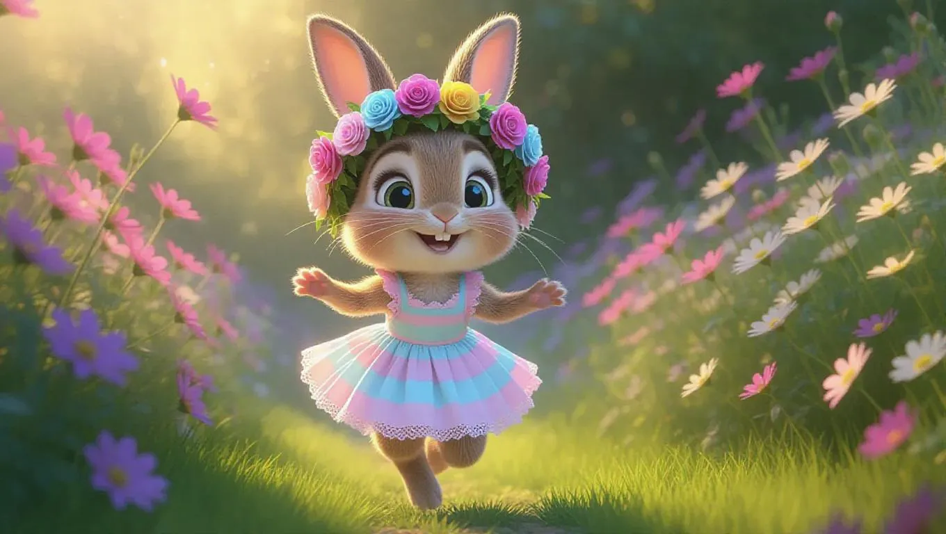 A spirited little rabbit hops through the garden, its floral wreath resting atop its head. The rabbit wears a light blue and pink striped dress, with fluffy ears and pink paws. Its eyes are bright and joyful, and it appears to be frolicking. The background is a blooming garden, ensuring the focus stays squarely on the rabbit. The lighting is soft and colorful, enhancing the whimsical, Pixar-style rendering.